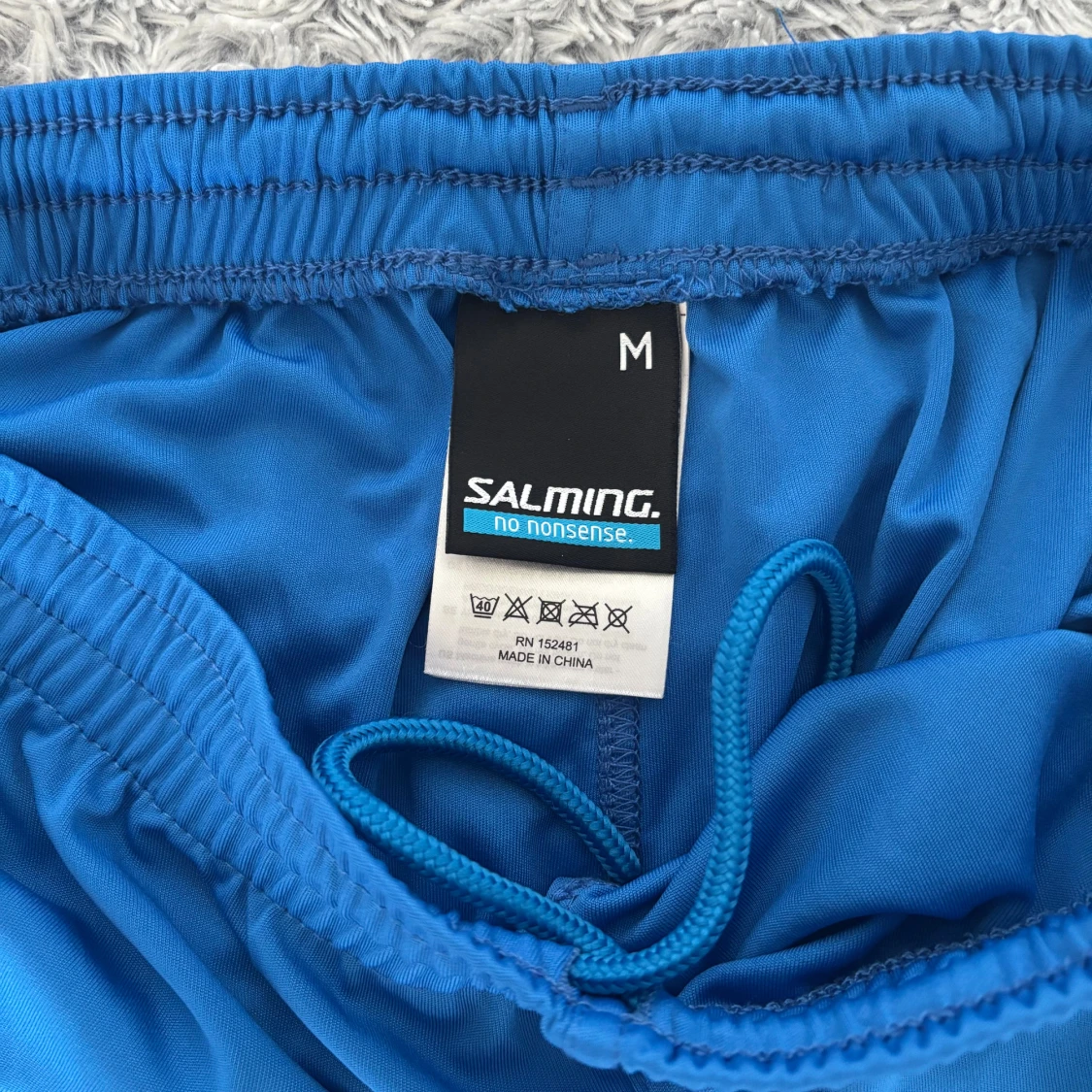 Snygga blå träningsshorts från Salming med elastisk midja och snörning för perfekt passform. Tillverkade i lätt och smidig polyester som andas bra. Perfekta för sport och aktivitet, med stilren design och logga på benet.