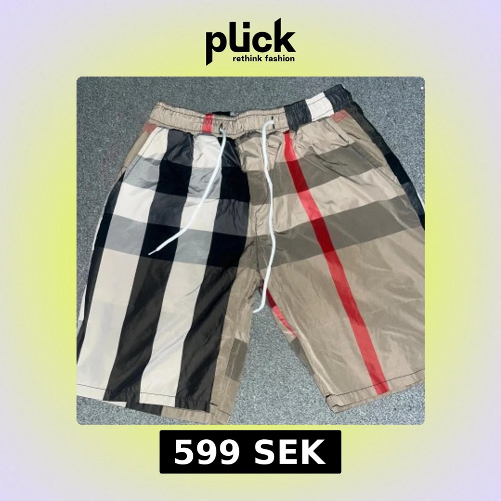 Säljer ett par rutiga shorts med breda beige, svarta, vita och röda ränder. De har elastisk midja med vit snörning och är tillverkade i ett lätt, syntetiskt material. Perfekta för sommaren och har en loose passform.