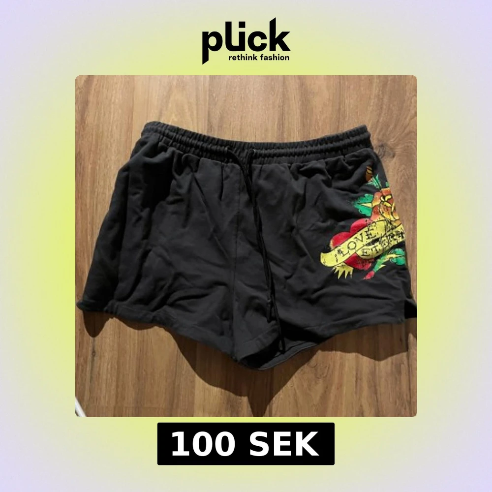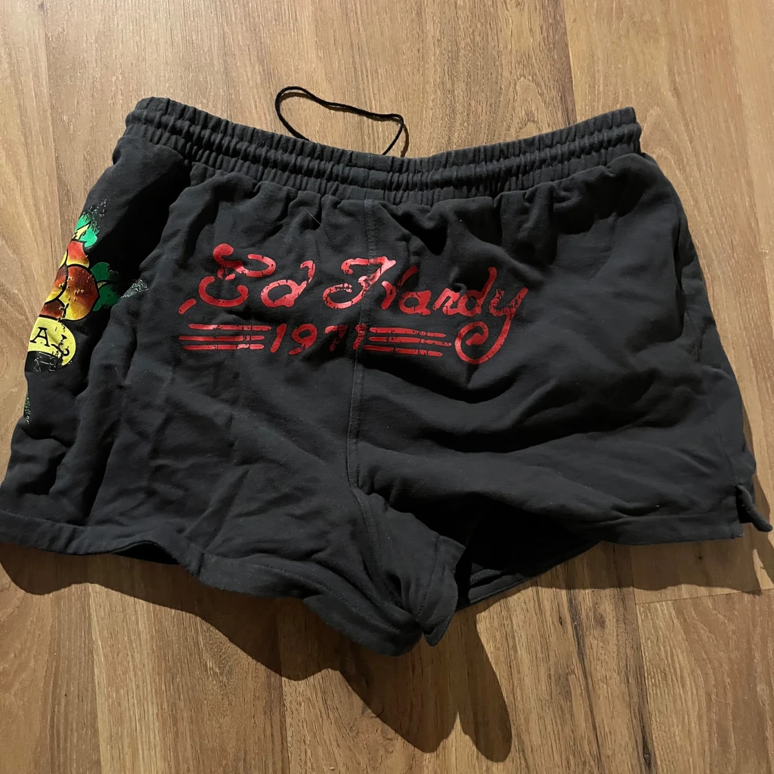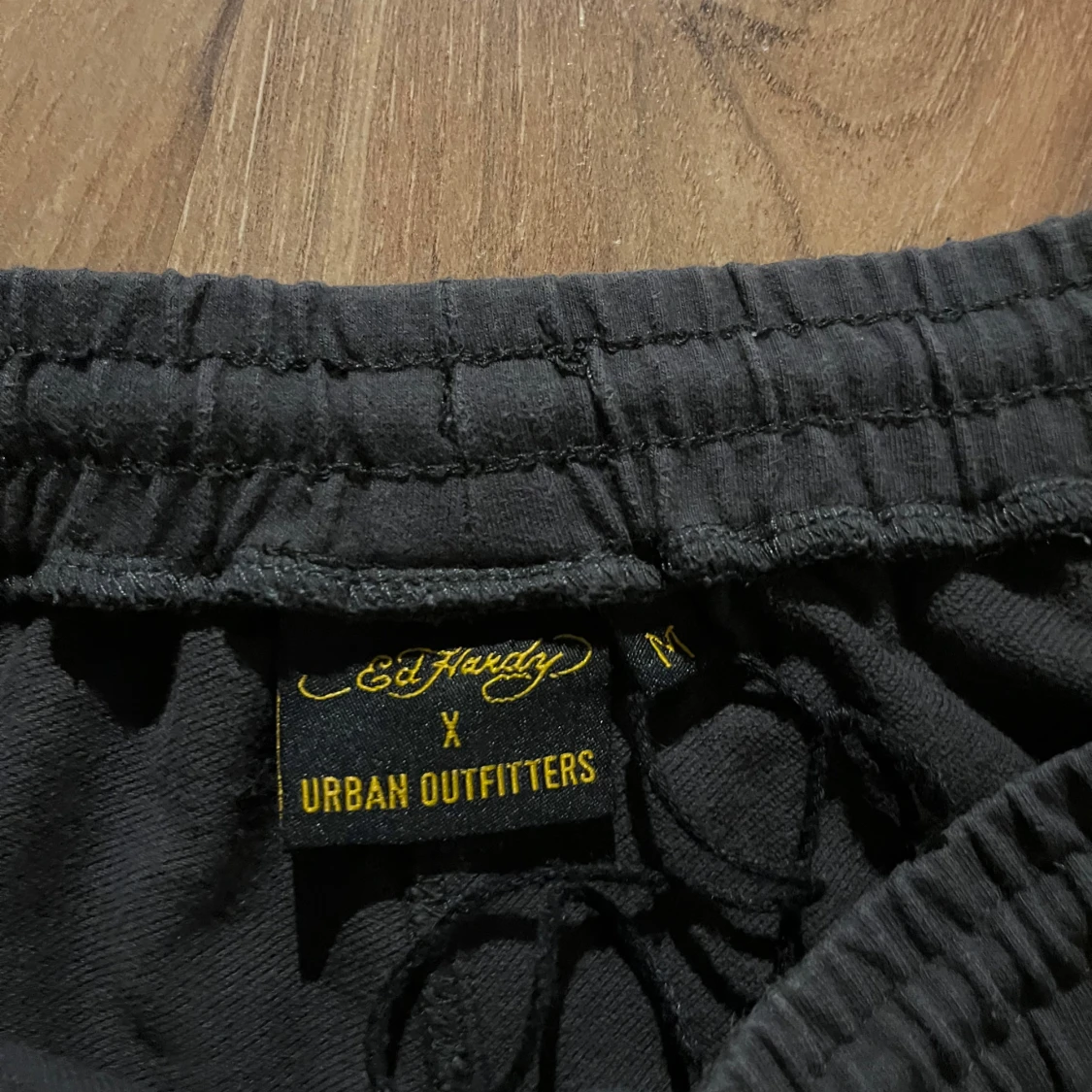Säljer ett par svarta shorts från Ed Hardy x Urban Outfitters med färgglatt tryck och text. De har en elastisk midja med dragsko för justerbar passform. Perfekta för en avslappnad stil.