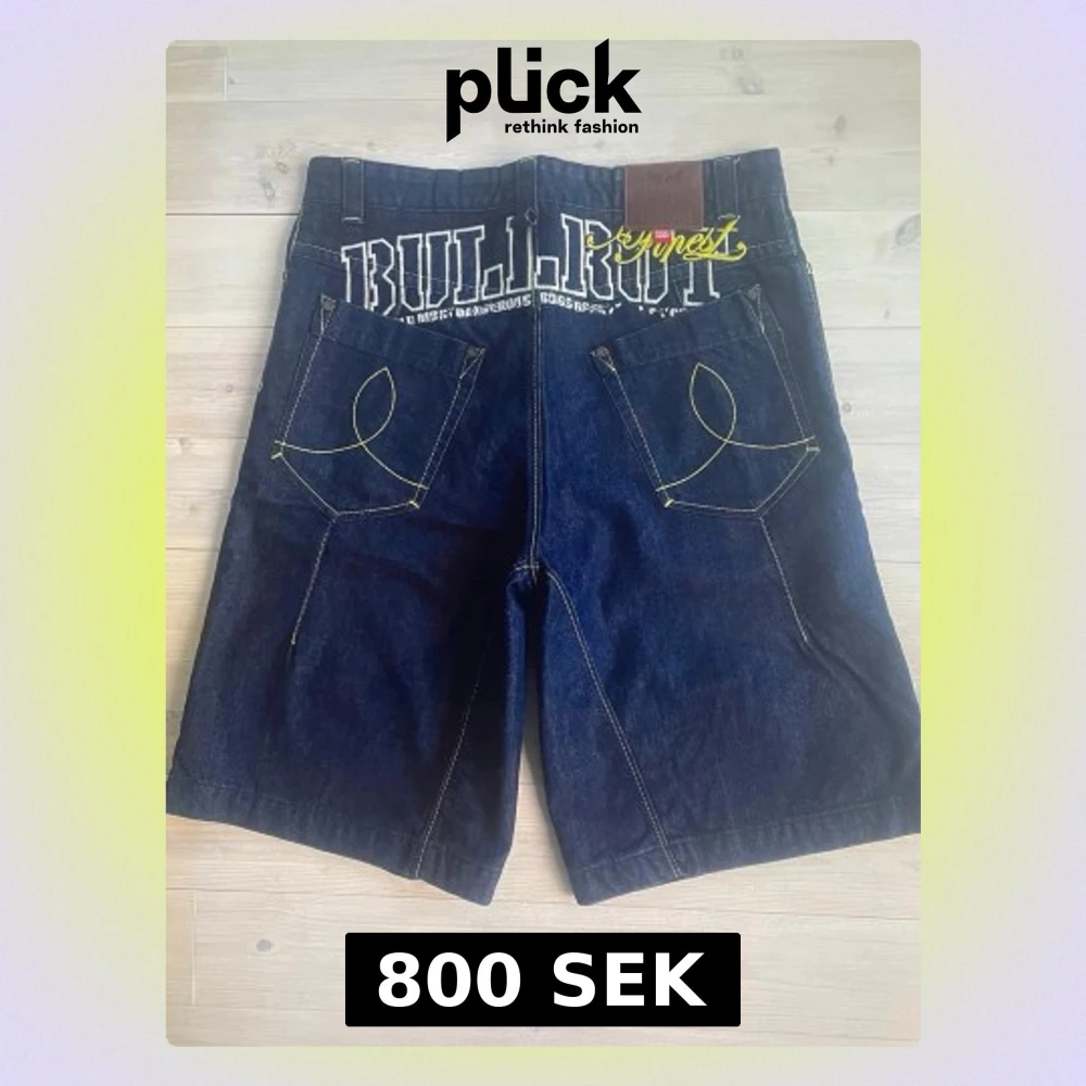 Snygga denimshorts från Bullrot Wear i mörkblå tvätt med kontrastsömmar i gult. Klassisk jeansmodell med unika detaljer som broderad logga, tryck baktill och kraftig denimkvalitet. Rejäl dragkedja och knapp, femficksmodell samt coola sömmar på bakfickorna som ger extra karaktär. ✔ Nyskick. Använda en gång. ✔ Robust denim av hög kvalitet ✔ Street / urban stil ✔ Perfekta för sommar, festival eller vardag Storlek: M Färg: Mörkblå denim