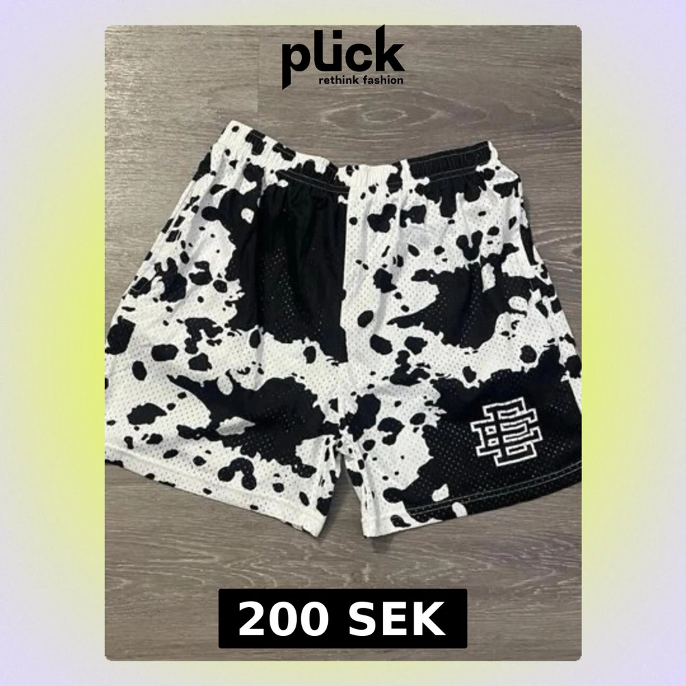 Säljer ett par svarta och vita meshshorts från Eric Emanuel med coolt koskinnsmönster och logga på vänster ben. Shortsen har elastisk midja och är tillverkade i ett ventilerande meshmaterial som passar perfekt till sommaren.