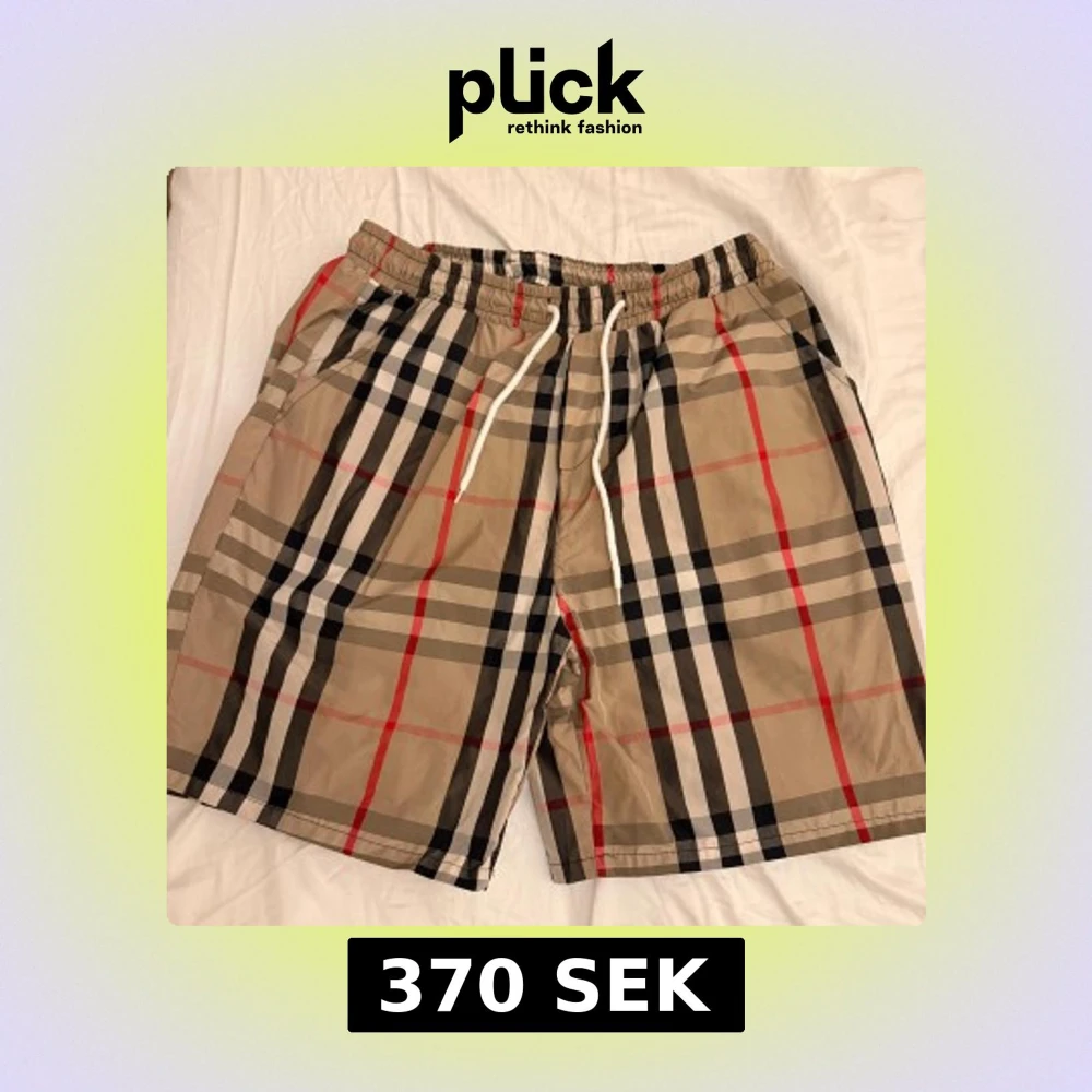 Säljer ett par snygga shorts med klassiskt rutigt mönster i beige, svart, vitt och rött. De har elastisk midja med vit snörning och sidofickor. Perfekta för chill dagar och har en riktigt clean streetstil.