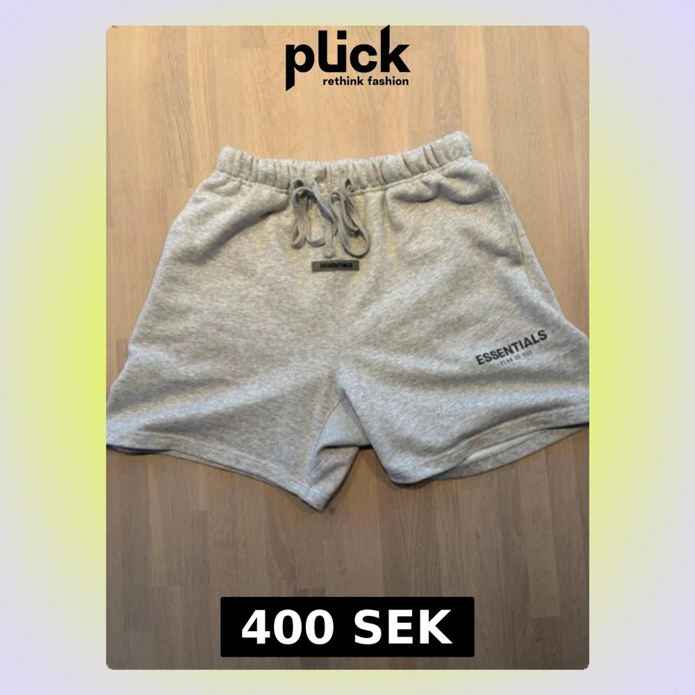 Snygga grå shorts från Essentials Fear of God med elastisk midja och snörning. Tillverkade i mjuk bomullsmix och har logga tryckt på vänster ben. Perfekta för chill eller streetwear-stil.