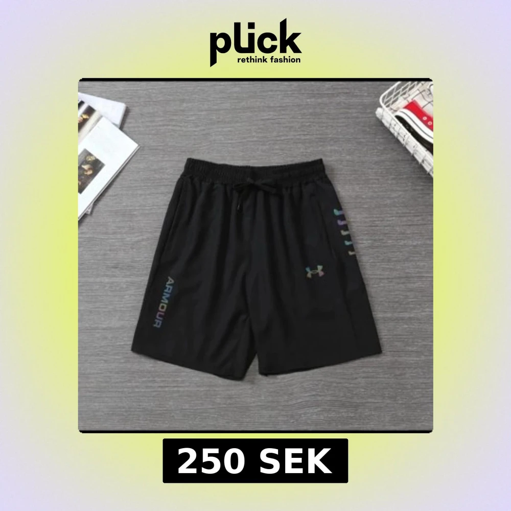 Svarta träningsshorts från Under Armour med elastisk midja och snörning. Shortsen har regnbågsfärgad logga och textdetaljer på ena benet. Perfekta för gymmet eller löprundan, tillverkade i lätt och snabbtorkande syntetmaterial.