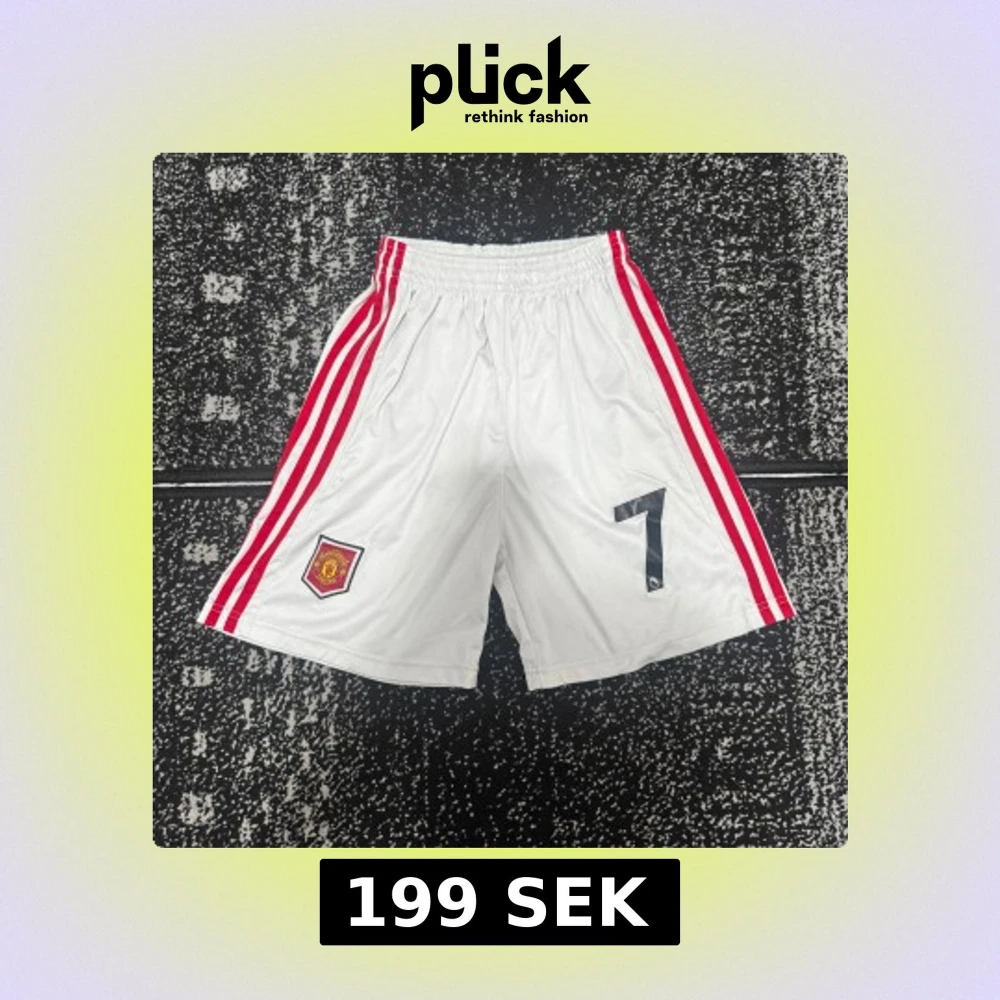 Vita Manchester United shorts med röda ränder på sidorna, broderad klubbmärke och svart nummer 7. Elastisk midja med snörning för perfekt passform. Tillverkade i lätt polyester, perfekta för fotbollsträning eller match.