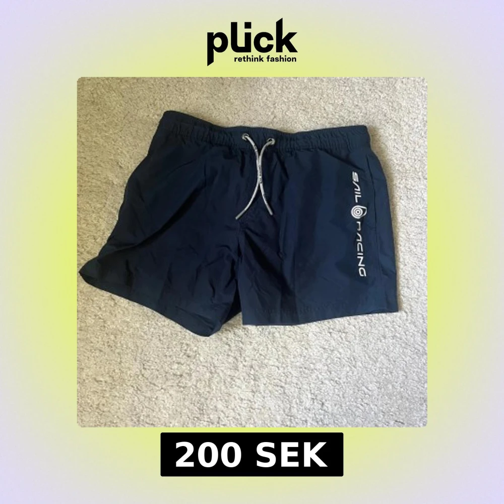 Snygga marinblå badshorts från Sail Racing med vit logga på ena benet och snörning i midjan. Shortsen har elastisk midja och en bakficka med logotyp. Perfekta för strand eller pool. Barnstorlek 170 vilket motsvarar i shorts XS/S i vuxenstorlek.