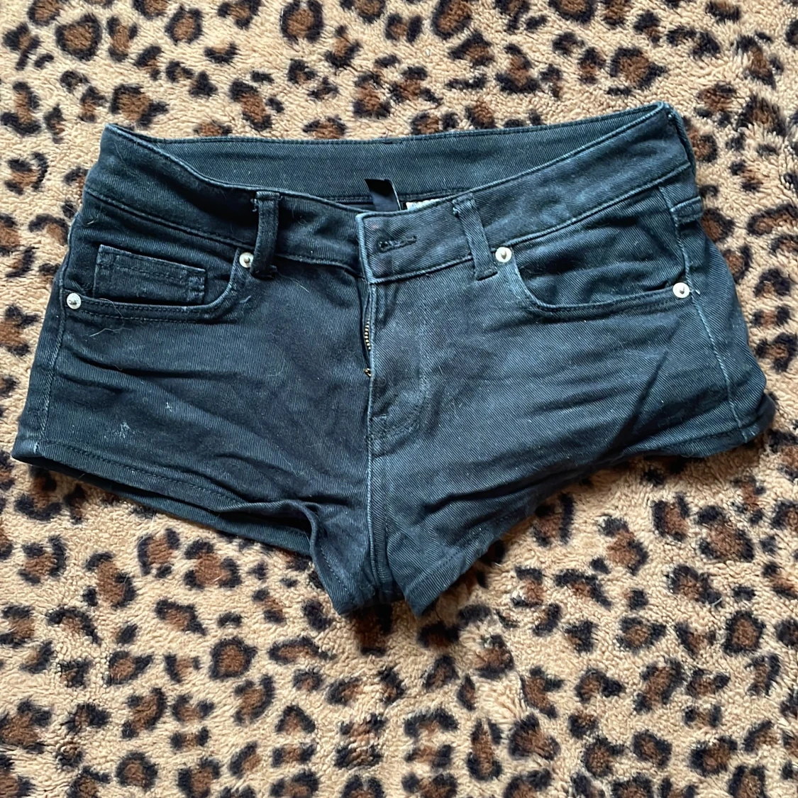 Snygga svarta mini jeansshorts med låg midja och klassisk