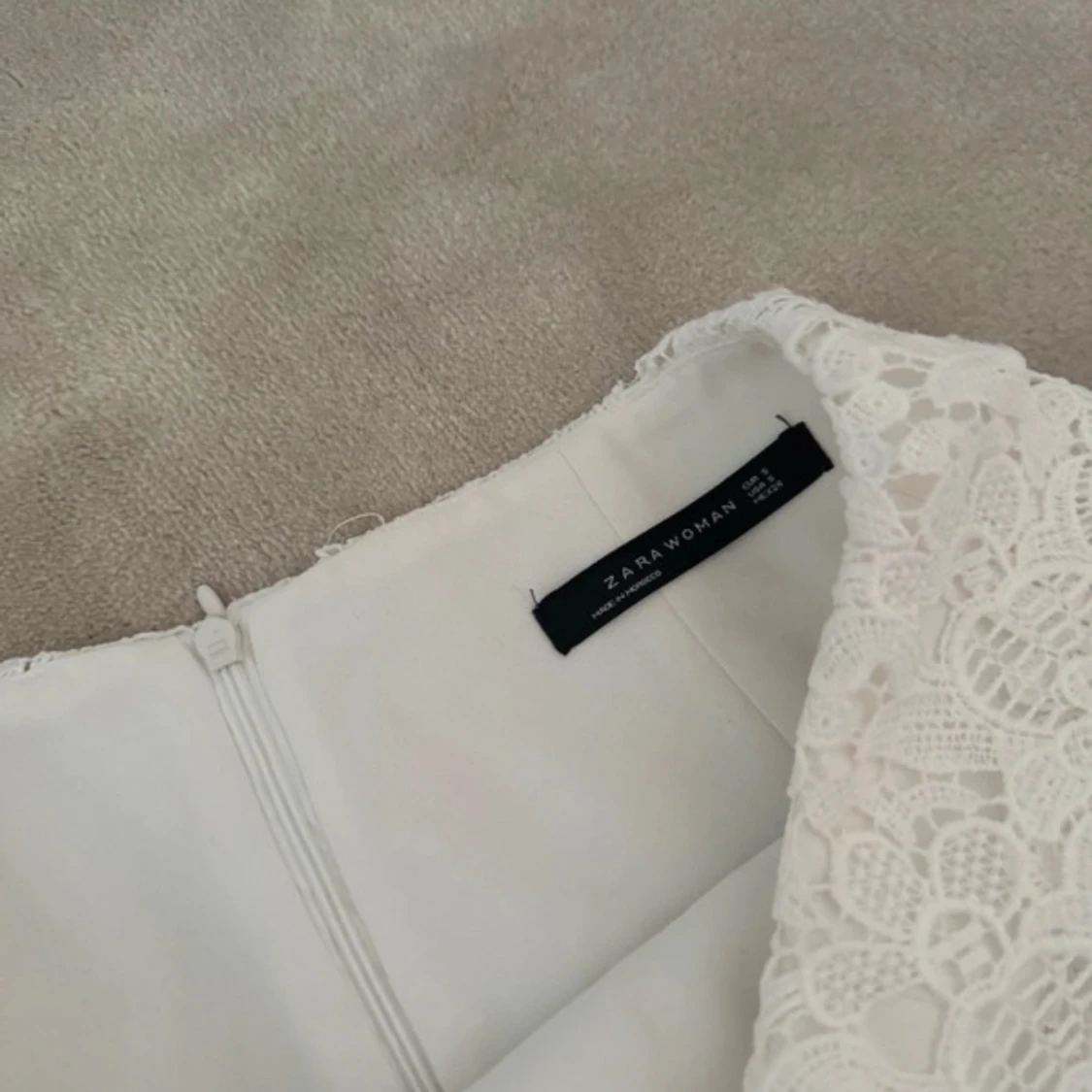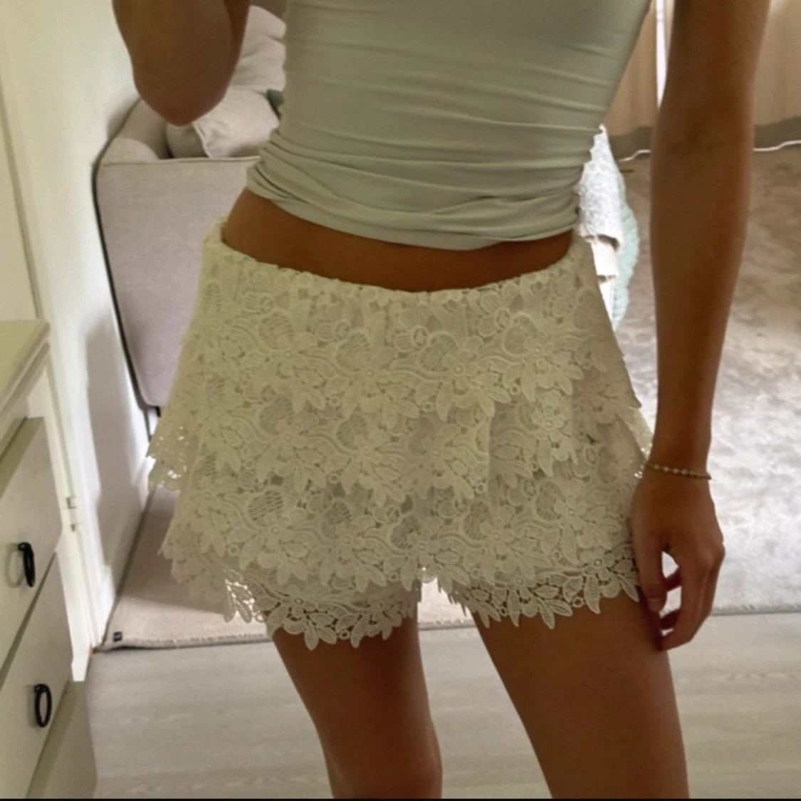 Supersöta populära vita shorts från Zara med blommig spets och volangdetaljer. De är högmidjade och har en dold dragkedja i sidan! Storlek S