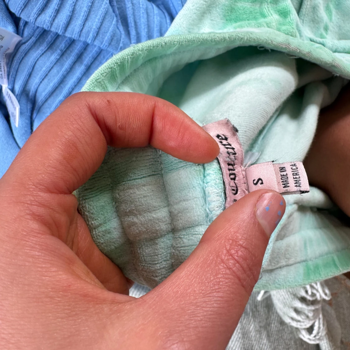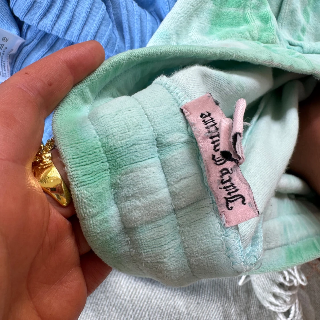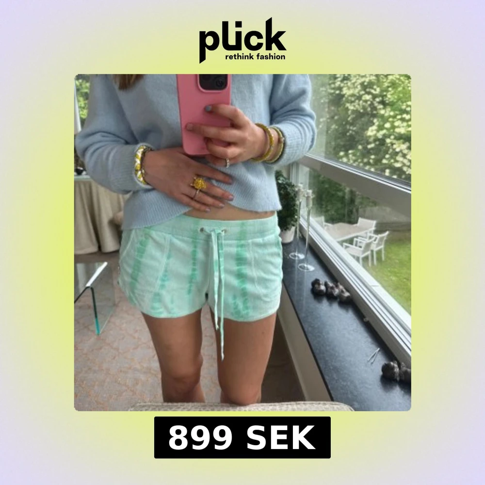 Supermjuka mintgröna shorts från Juicy Couture i frotté med ljusgrönt batikmönster. De har snörning i midjan, fickor fram och en liten JC-logga på ena fickan. Perfekta för chill dagar eller sommarhäng.