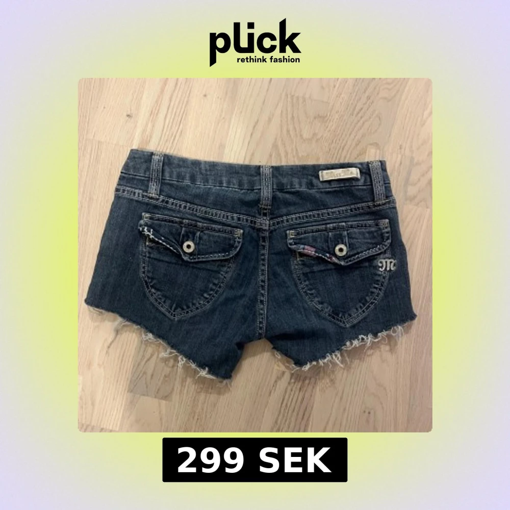 Snygga mörkblå jeansshorts från Miss Me med råa, fransiga kanter och dekorativa bakfickor med knapp. Shortsen har låg midja, klassiska bälteshällor och coolt mönstrat tyg på insidan av linningen. Perfekta för sommaren!