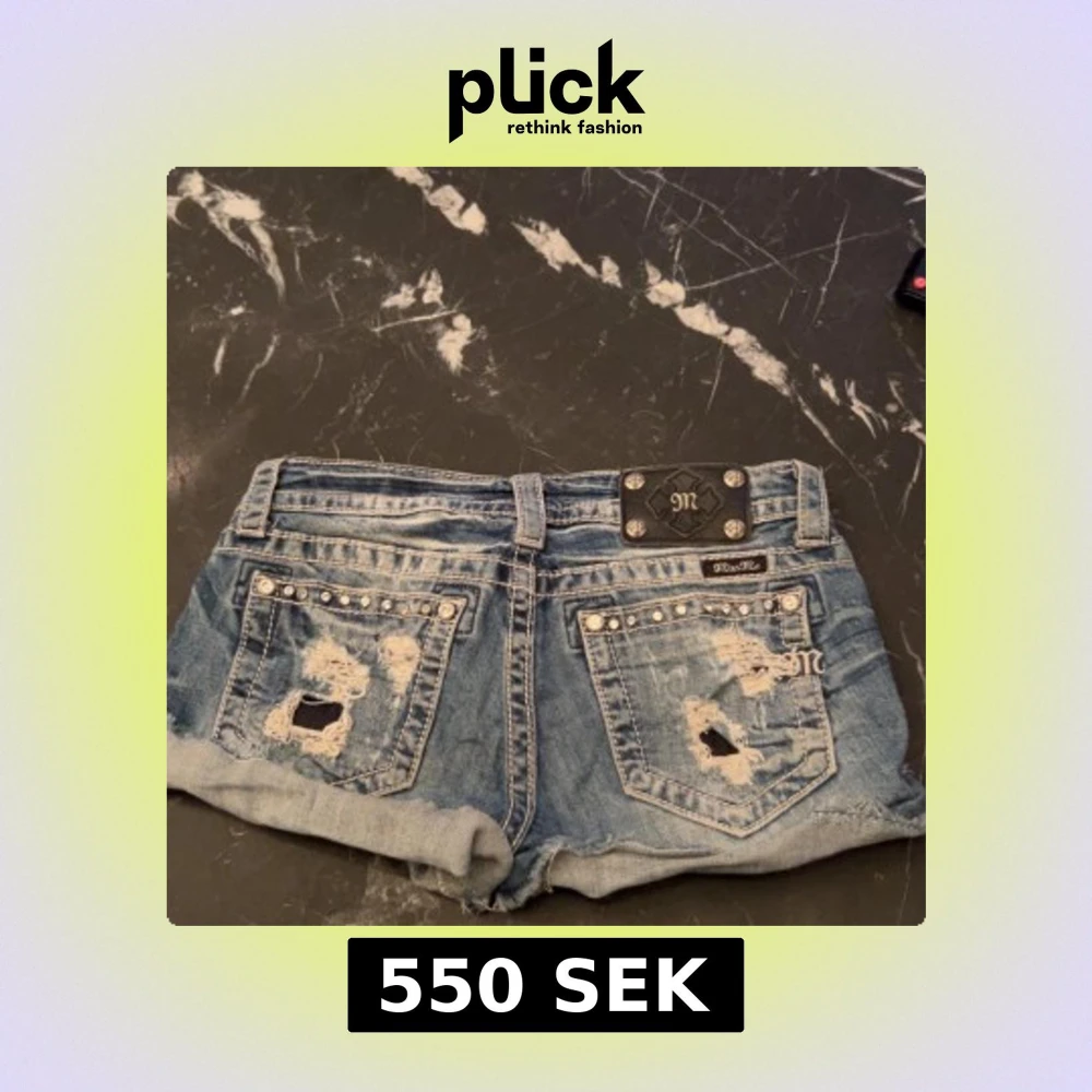 Säljer ett par blå jeansshorts från Miss Me med coola slitningar, nitar och stjärnmönster på framsidan. Shortsen har uppvikta ben och detaljerade bakfickor med nitar och broderi. Perfekta för sommaren!