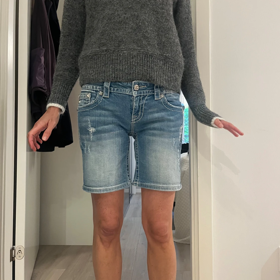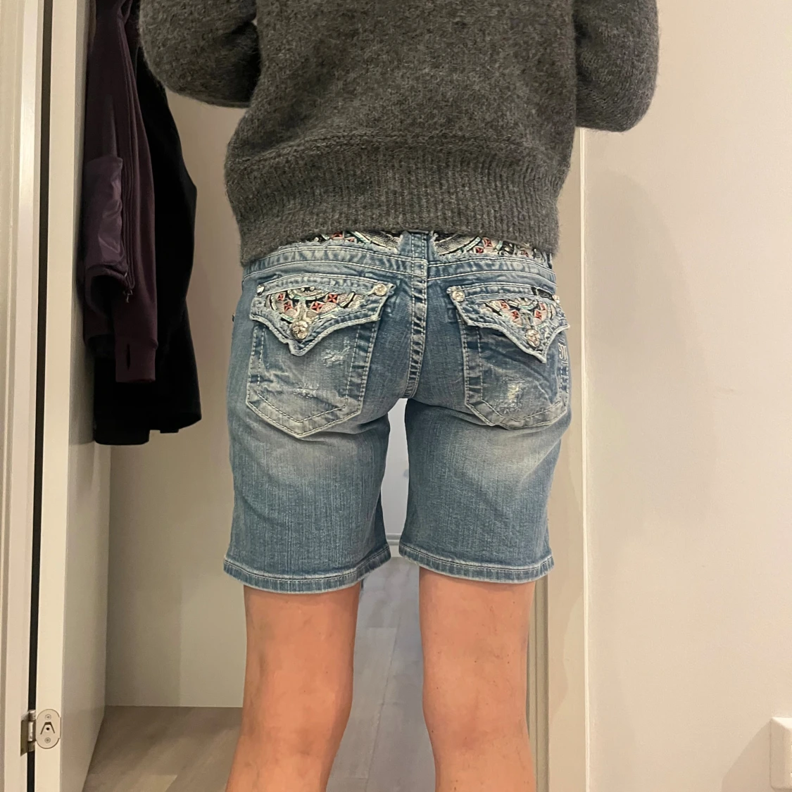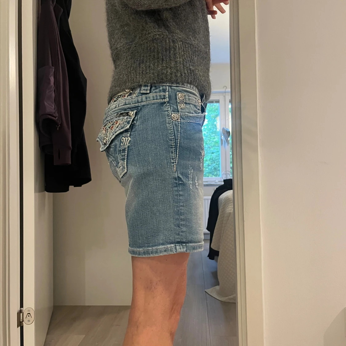 Säljer ett par ljusblå jeansshorts från Miss Me med snygga slitningar och broderade bakfickor med knappar. Klassisk femficksmodell och normal passform, perfekt för sommardagar. Shortsen har låg midja och coola detaljer på fickorna.