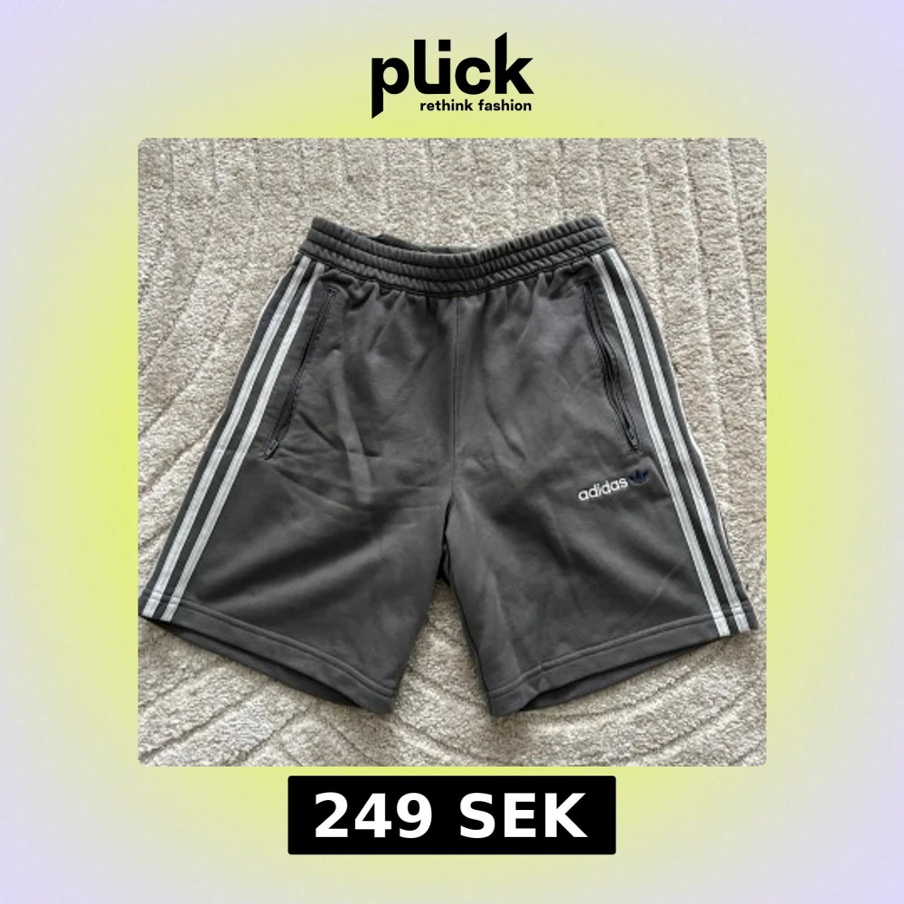Snygga grå shorts från Adidas med klassiska vita ränder längs sidorna. De har en elastisk midja och praktiska dragkedjefickor. Perfekta för en sportig look!
