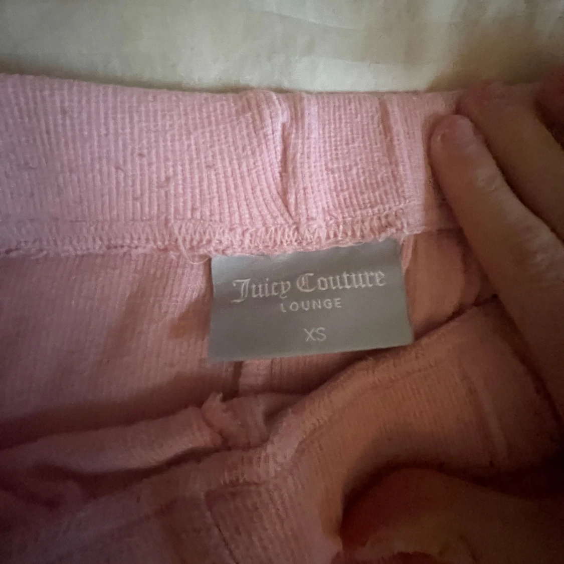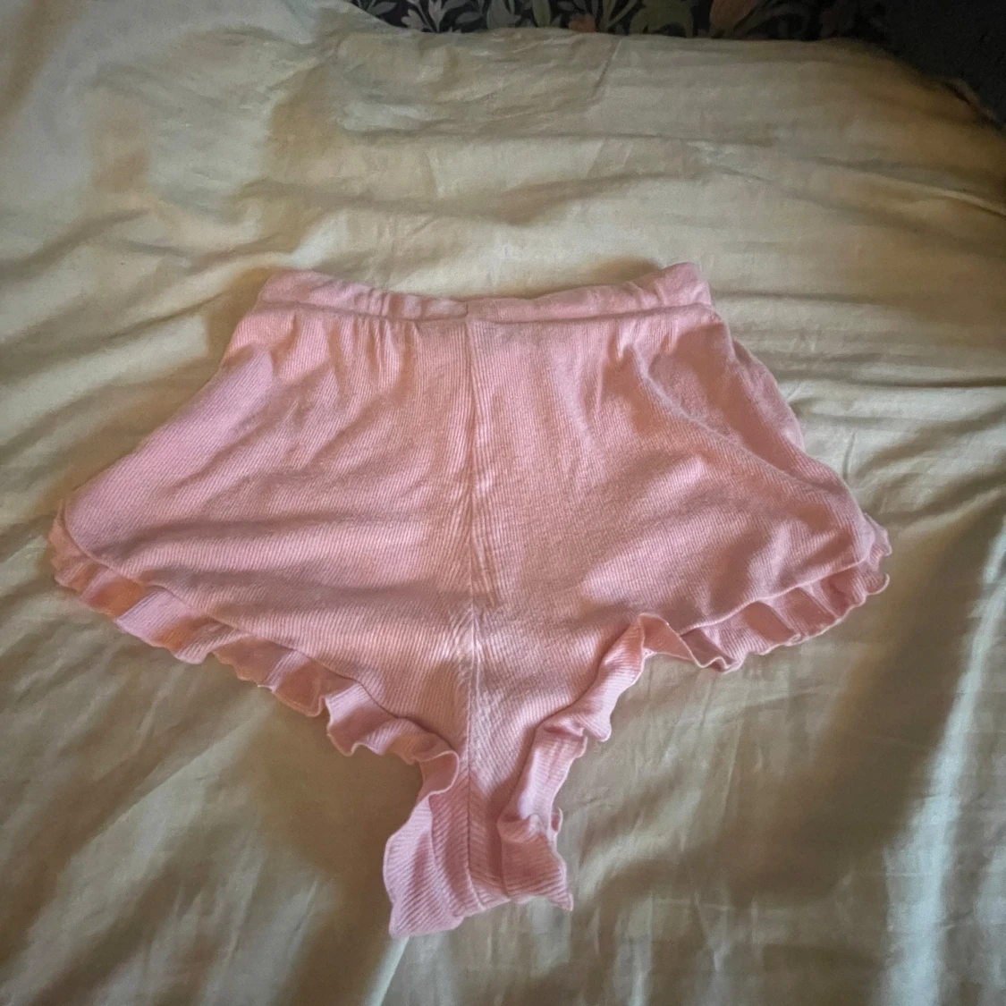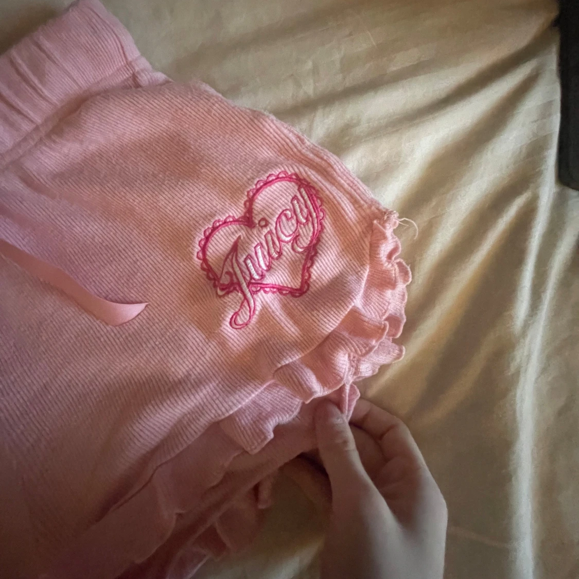 Söta rosa shorts från Juicy Couture med volangdetaljer och en rosett framtill. Broderad hjärtdetalj med texten 'Juicy' på sidan. Perfekta för en avslappnad dag hemma. Ny pris 500kr