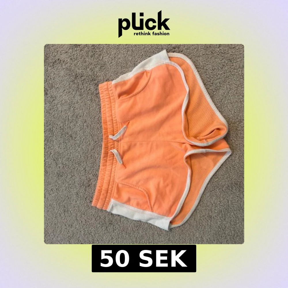 Snygga orangea shorts från H&M med vit kant och snörning i midjan. Modellen är loose fit med elastisk midja och praktiska fickor. Lite nopprig och har en fläck på baksidan.