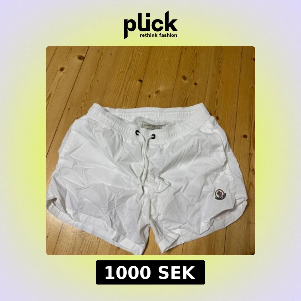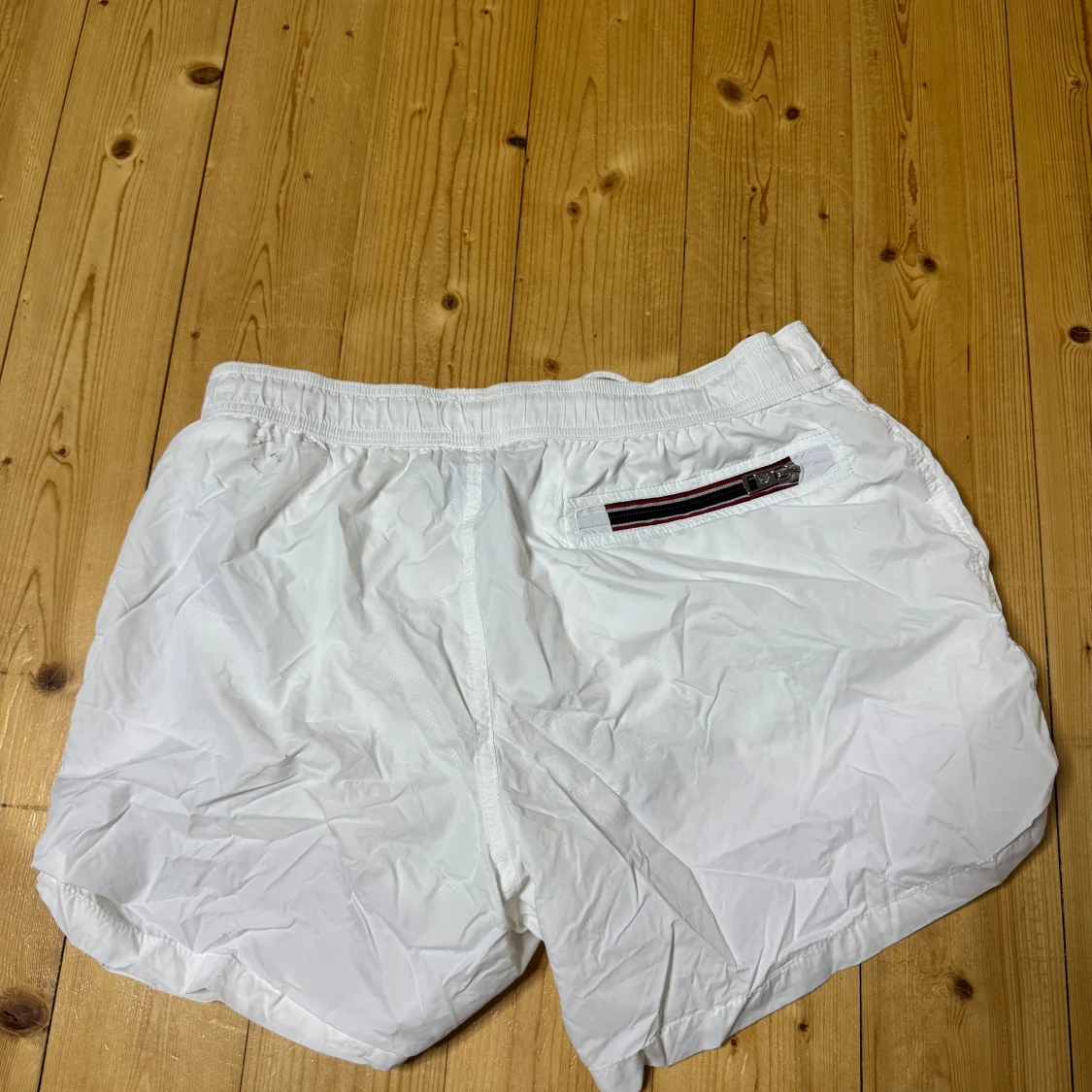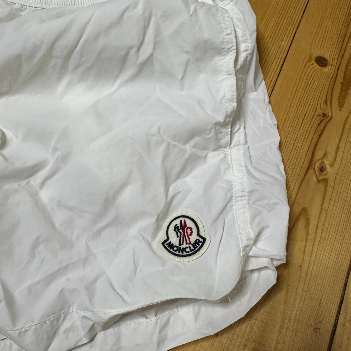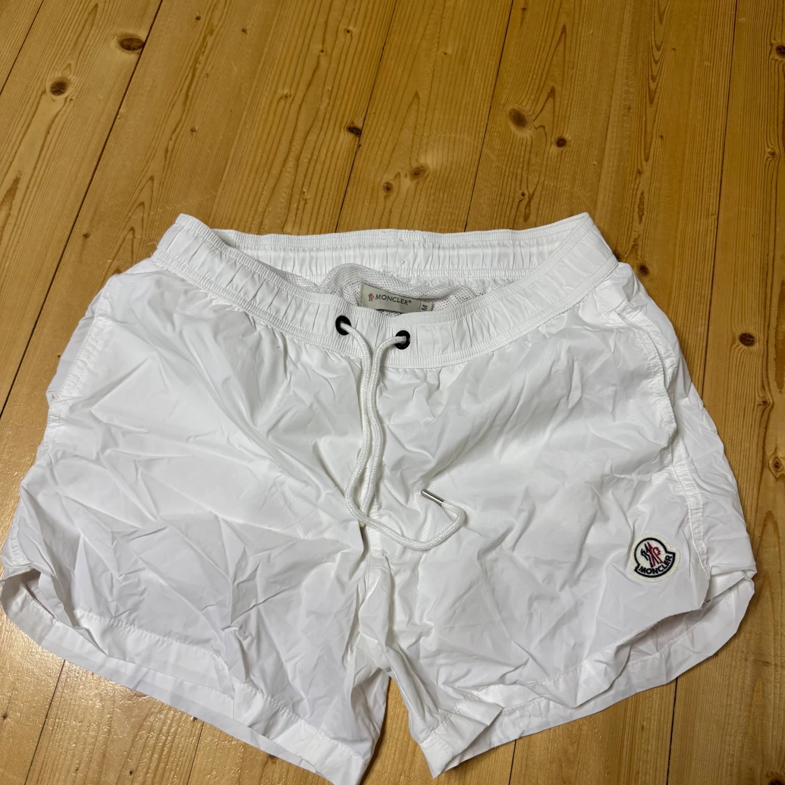 Snygga vita badshorts från Moncler med elastisk midja och snörning framtill. Shortsen har en bakficka med dragkedja och Moncler-logga på vänster ben. Perfekta för sommaren och strandhäng!