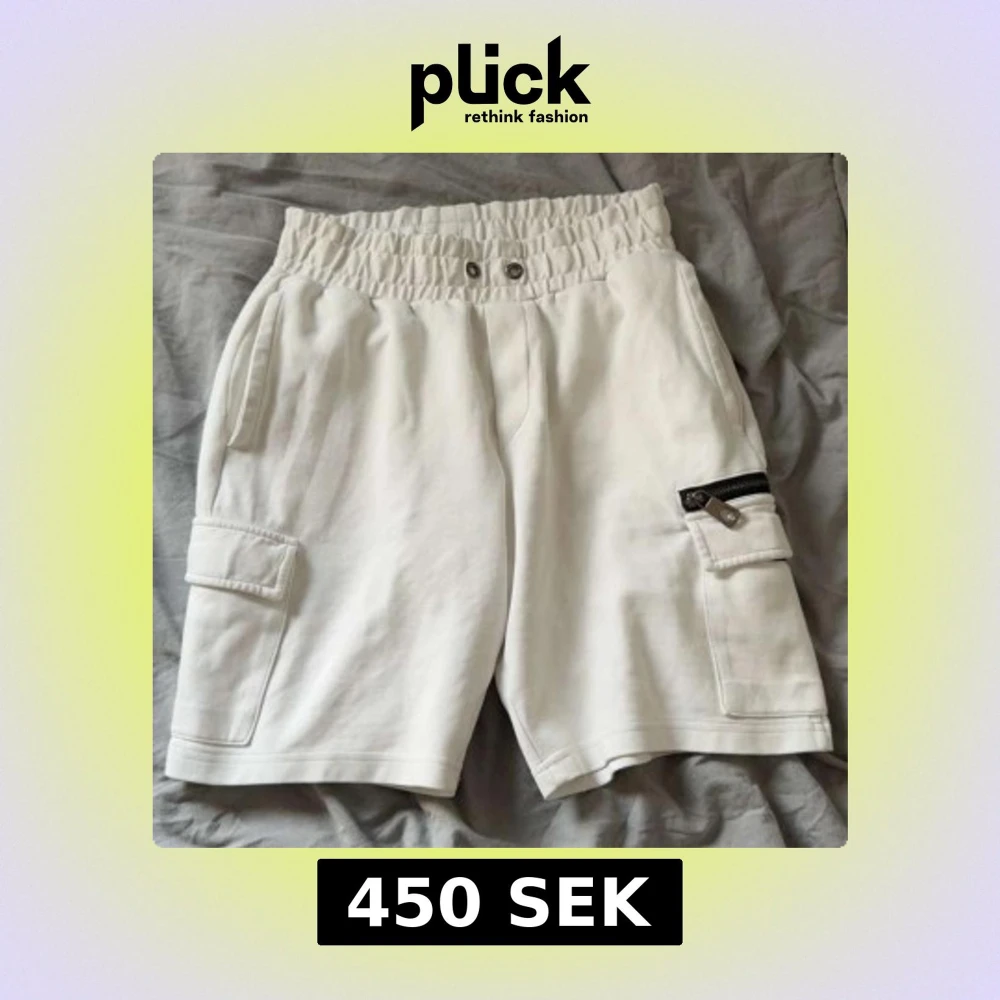 Säljer ett par vita shorts från Moncler med elastisk midja och snörning. Shortsen har flera fickor, inklusive cargofickor på sidorna och en bakficka med Moncler-logga. Detalj med dragkedja på ena fickan. Perfekta för sommaren.