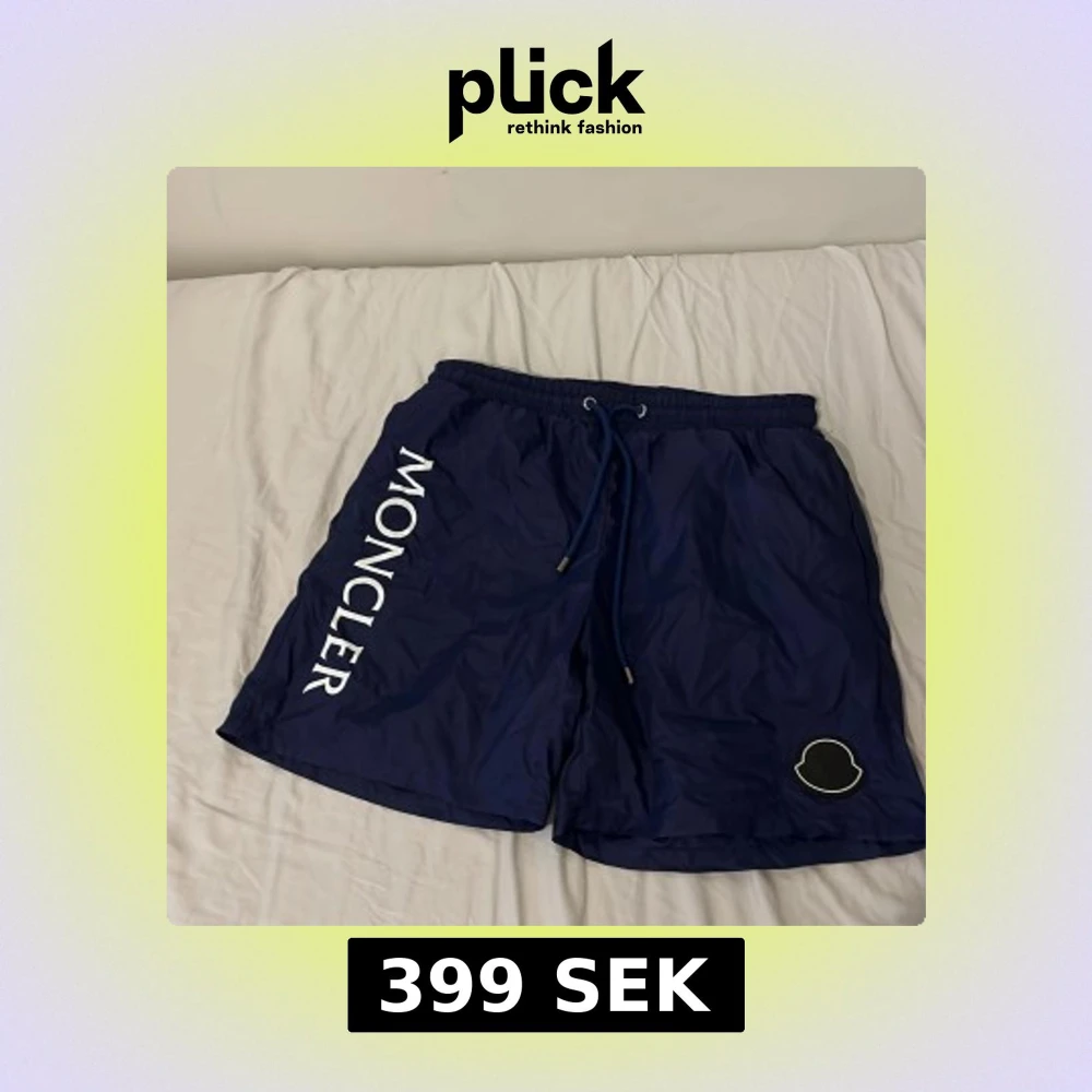 Snygga marinblå shorts från Moncler med vit logotyp längs benet och en rund Moncler-patch. De har elastisk midja med snörning och metalländar med Moncler-gravyr. Materialet är lätt och syntetiskt, perfekt för sommardagar eller bad.