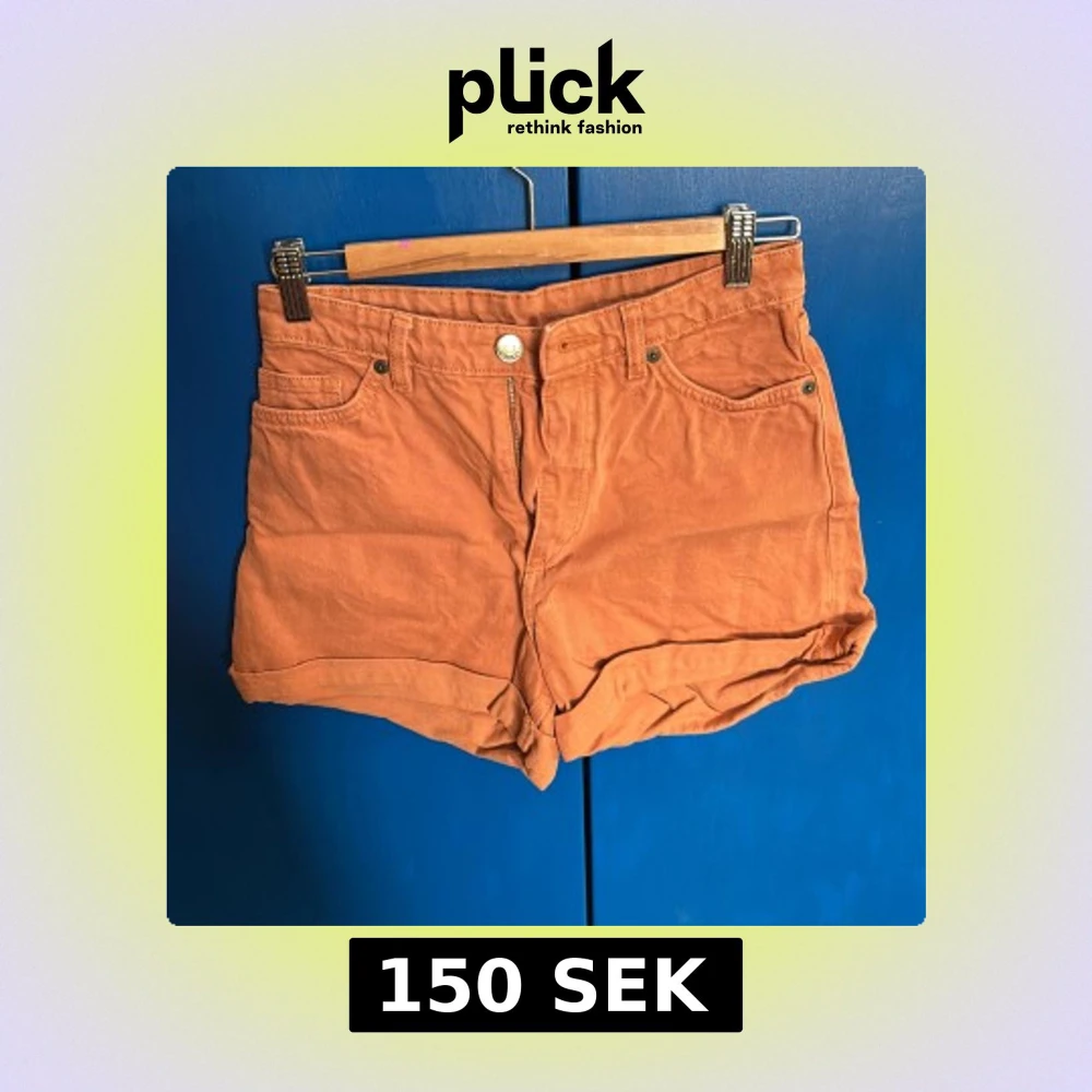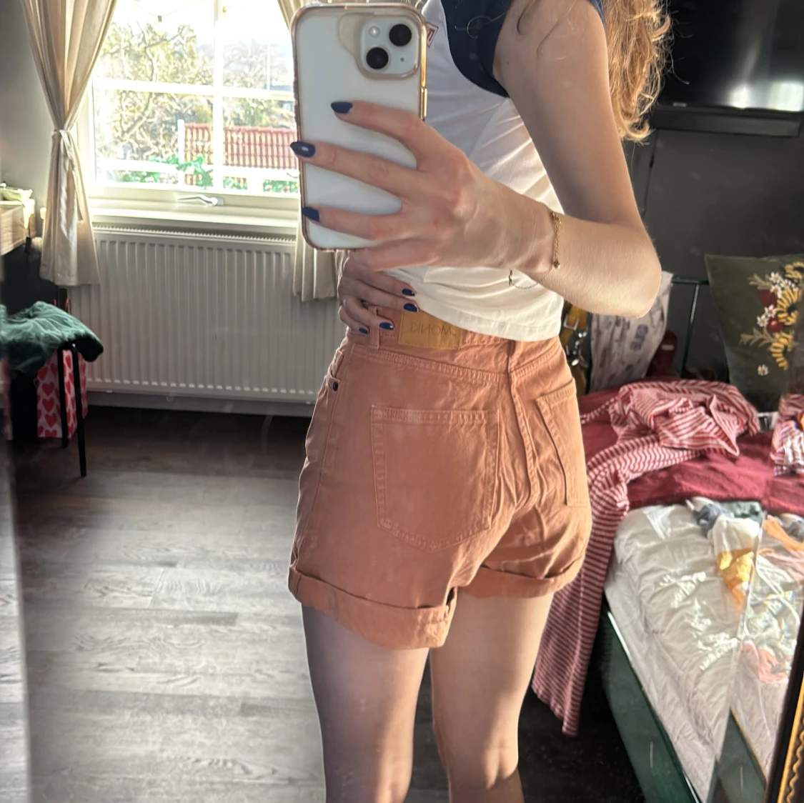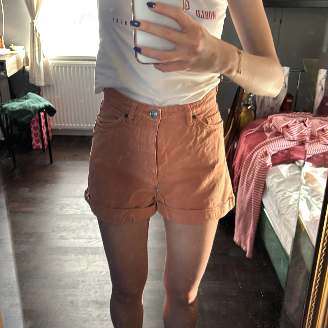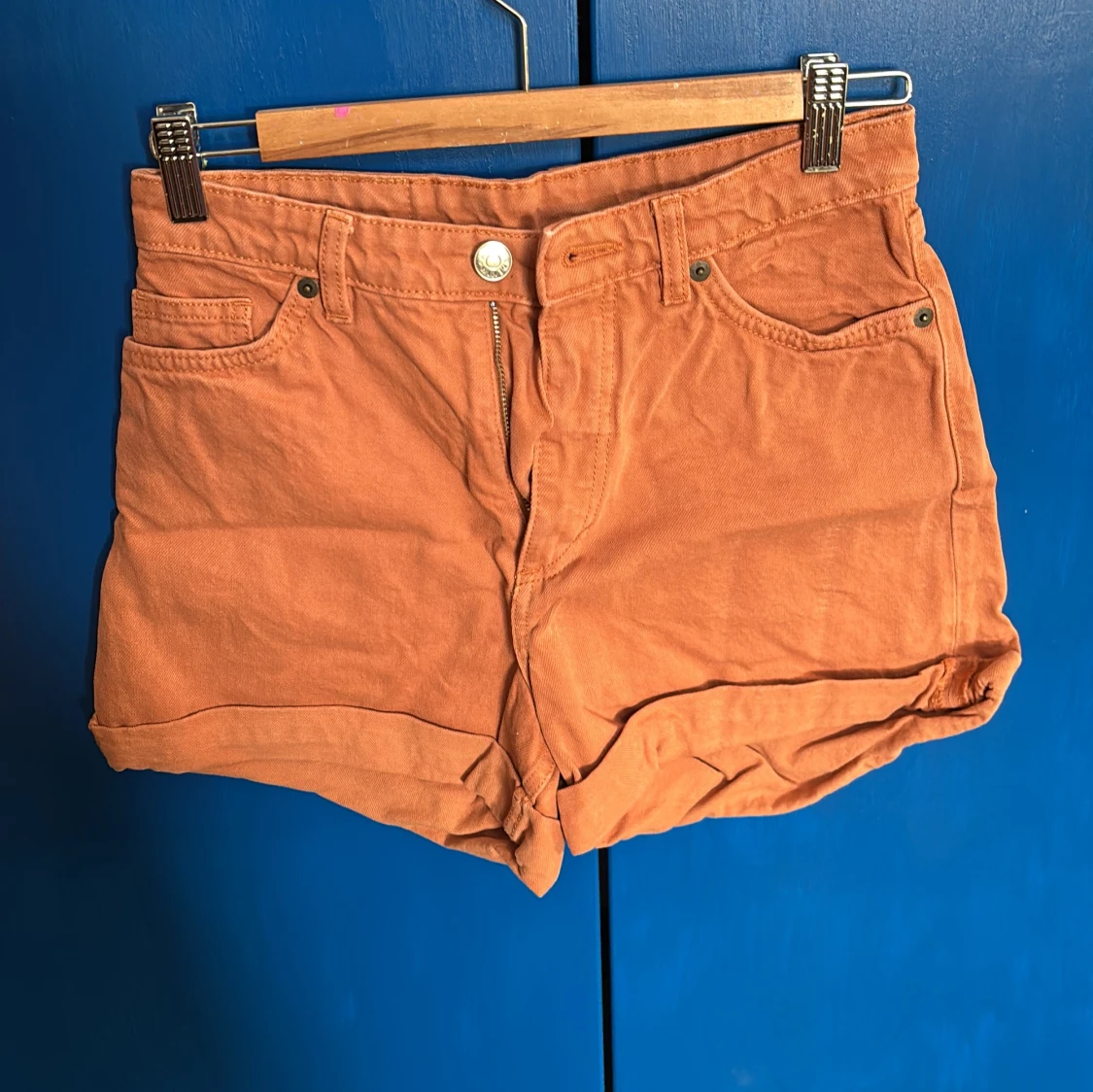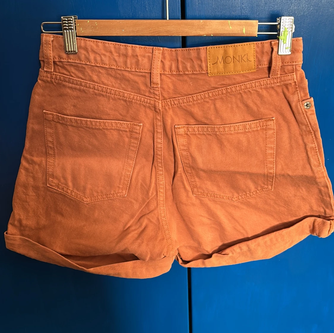 Högmidjade snygga orange shorts från Monki med klassisk femficksdesign och knappgylf. Även växt ur dessa men tycker dem är ur söta, även lite vintage look över dem😆