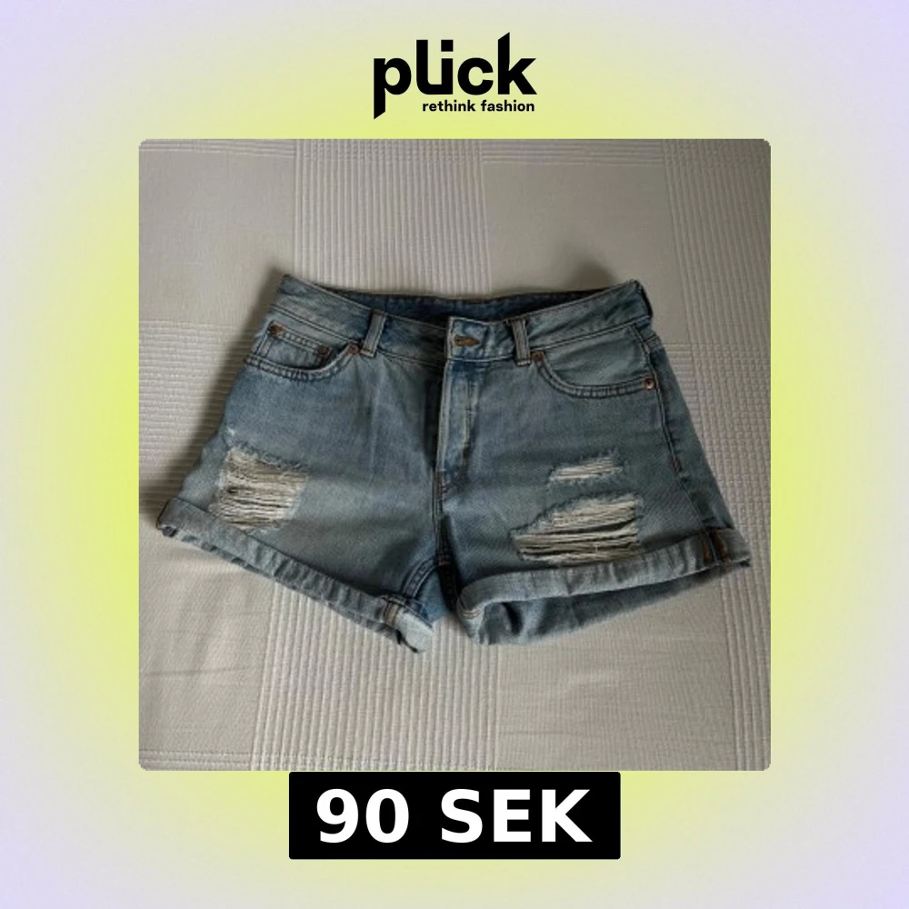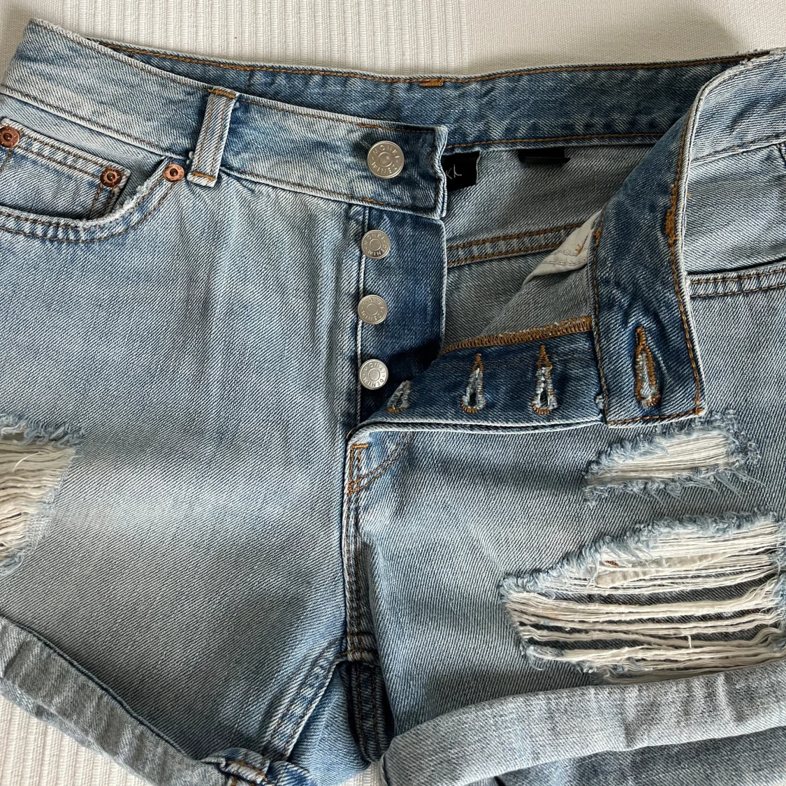 Jeansshorts från Monki. Shortsen är i en ljusare blå tvätt med slitningar framtill. Shortsen har 4 knappar framtill.