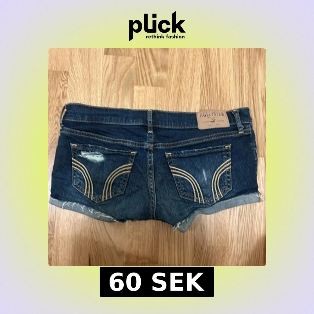 Snygga mörkblå jeansshorts från Hollister med slitna detaljer och uppvikta benslut. Shortsen har klassiska bakfickor med guldfärgad broderad söm och låg midja. Perfekta för en trendig y2k look. Dragkedjan är trasig men det går säkert att fixa och det är inget som syns när man har på sig dom.