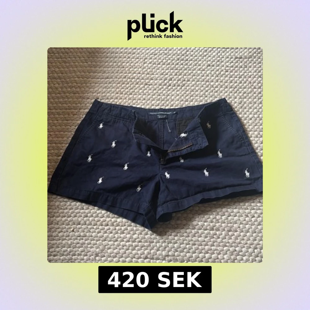 Snygga lågmidjade mörkblå shorts från Ralph Lauren med broderade vita polospelare över hela tyget. Klassisk passform med dragkedja och knäppning, samt fickor både fram och bak. Perfekta för sommardagar och chill häng.