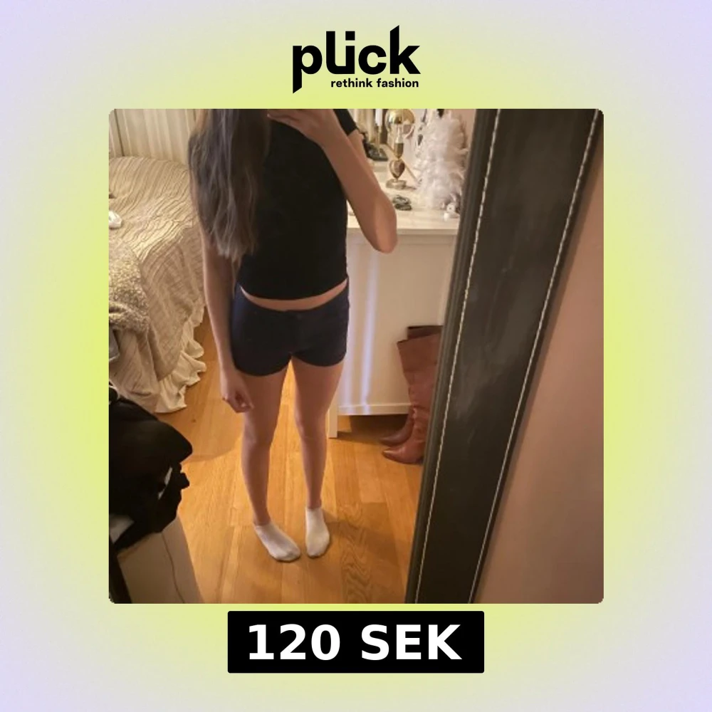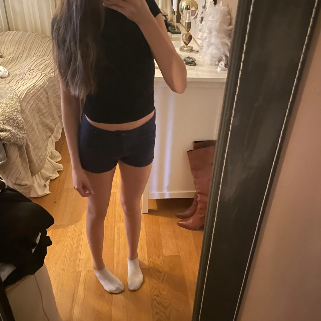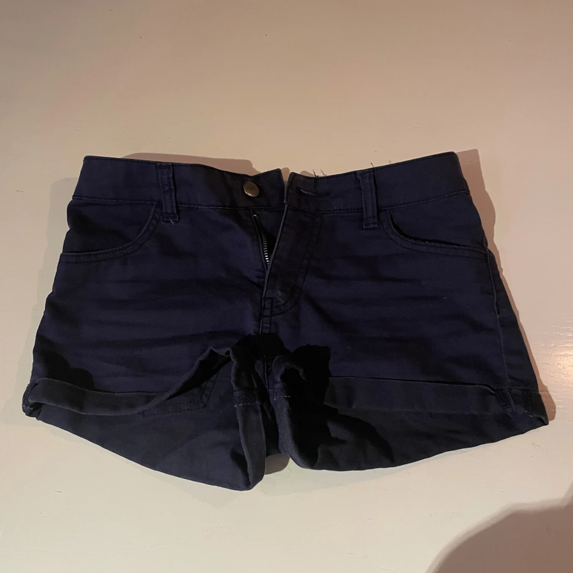 Säljer ett par mörkblå shorts med knapp och dragkedja framtill. De har en klassisk design med fickor och är perfekta inför sommaren!