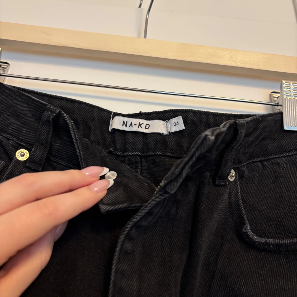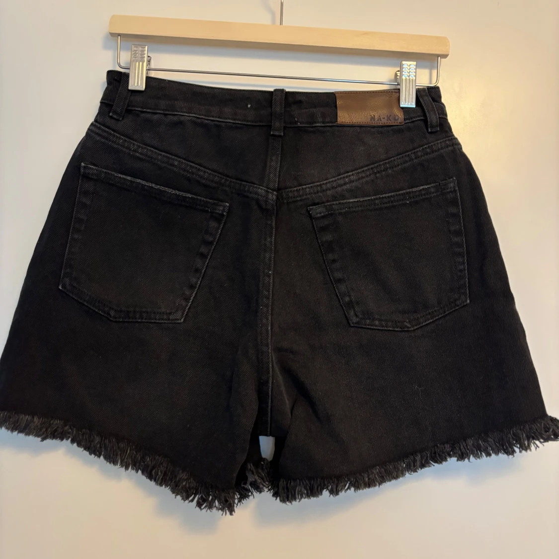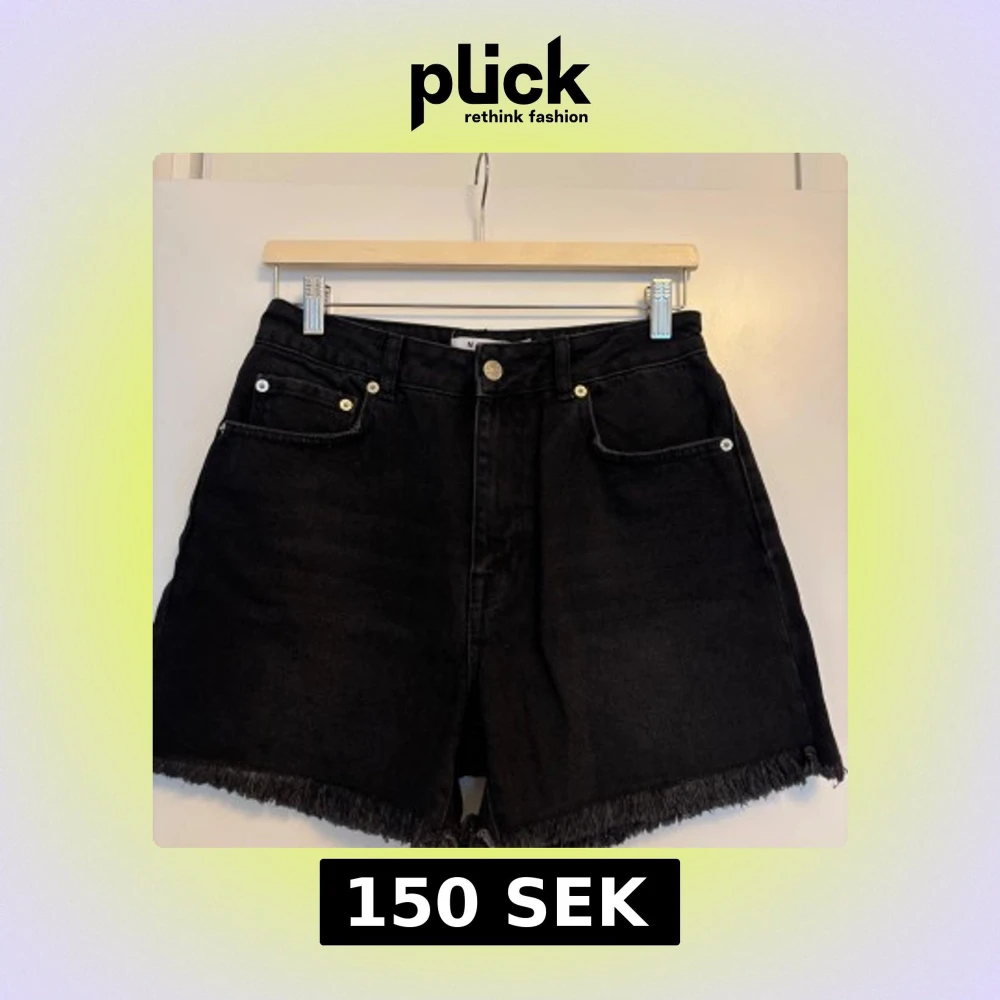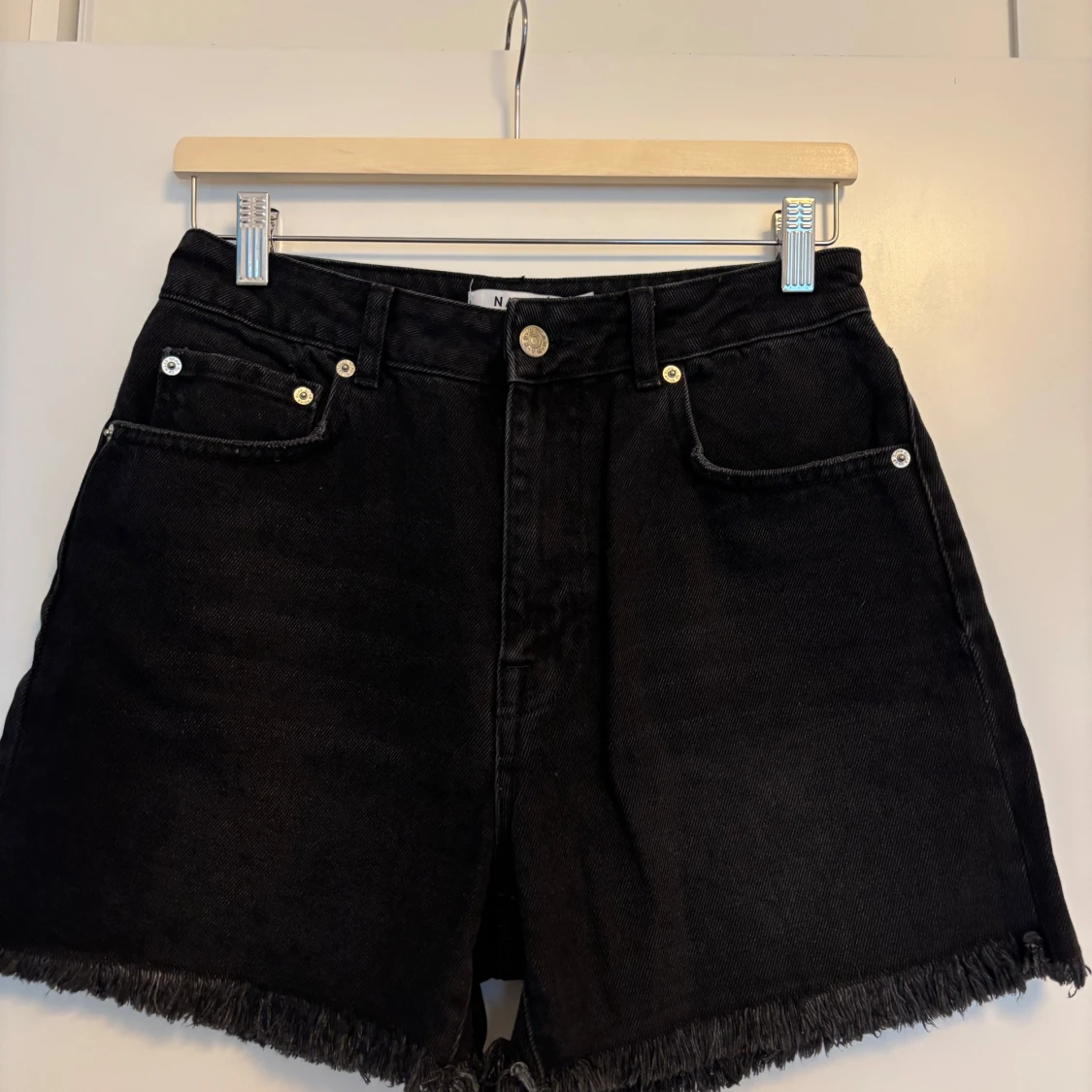 Snygga svarta jeansshorts från NA-KD med hög midja och råa fransade benslut. Klassisk femficksmodell med knapp och dragkedja framtill. Perfekta för en cool och avslappnad stil under sommaren.