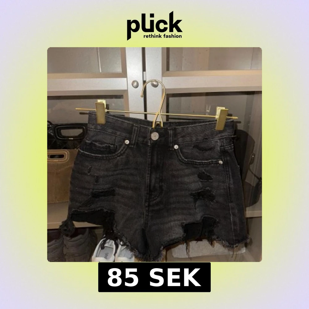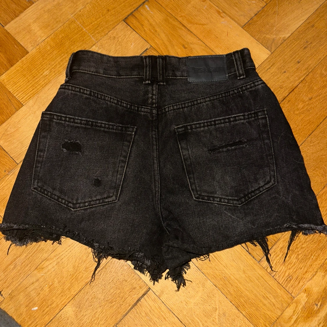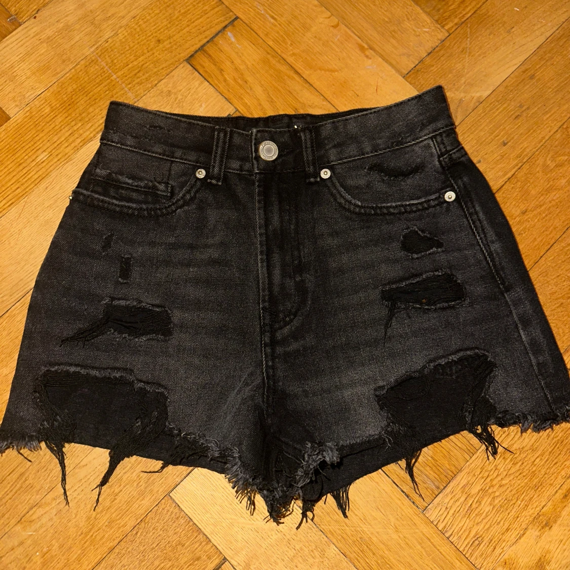 Snygga svarta jeansshorts med slitna detaljer och fransig kant. Perfekta för en avslappnad stil. De har en klassisk femficksdesign och knappgylf från new yorker