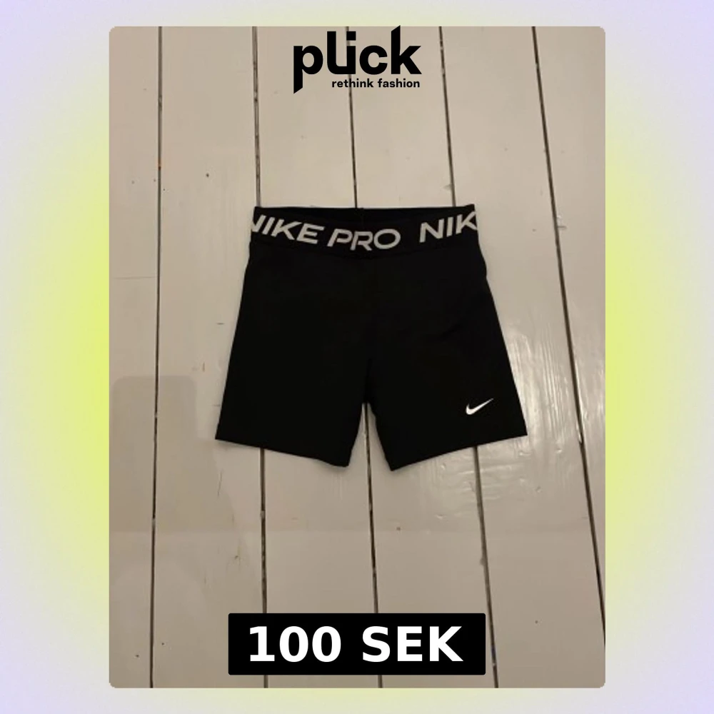 Svarta tighta träningstights shorts från Nike Pro med bred resår i midjan där det står 'NIKE PRO' i vitt. Klassisk vit Nike-logga på ena benet. Perfekta för gym, löpning eller annan träning. Stretchigt material för maximal rörelsefrihet.