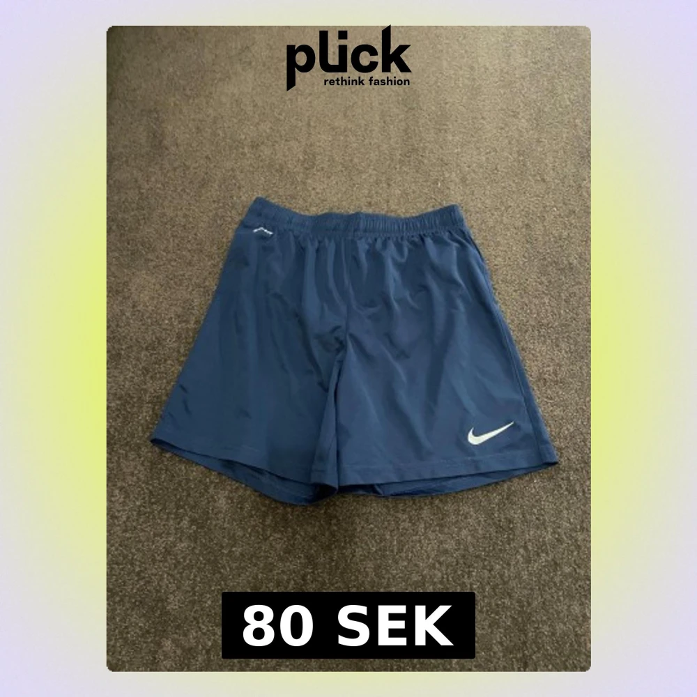 Säljer ett par blå Nike Dri-Fit shorts med elastisk midja och klassisk vit swoosh-logga broderad på benet. Perfekta för träning eller sport, tillverkade i lätt och ventilerande syntetmaterial som håller dig fräsch. Enkel design med loose passform.