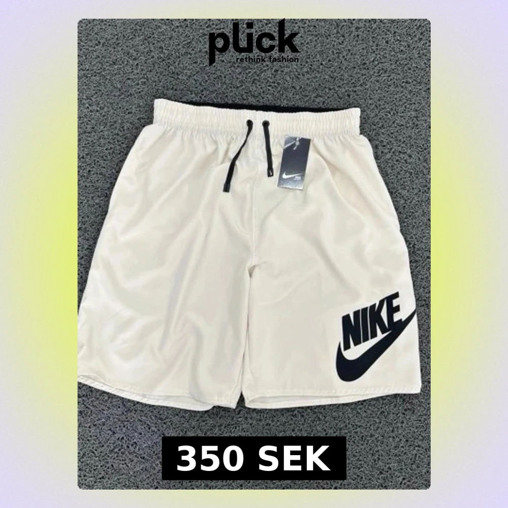Snygga beiga shorts från Nike med stor svart logga på vänster ben. De har elastisk midja med svarta dragsnören och är tillverkade i ett lätt och bekvämt material, perfekt för en avslappnad och sportig look.