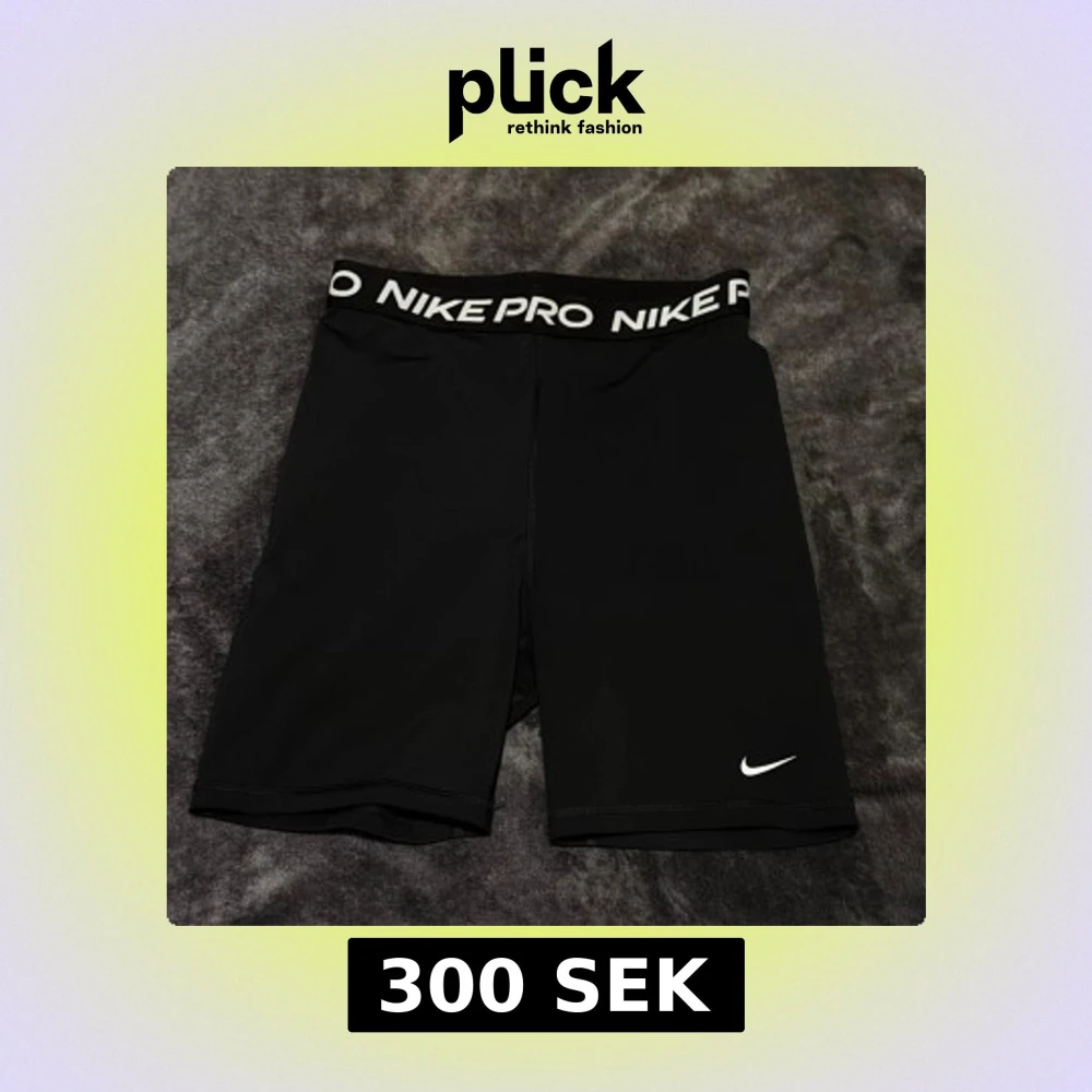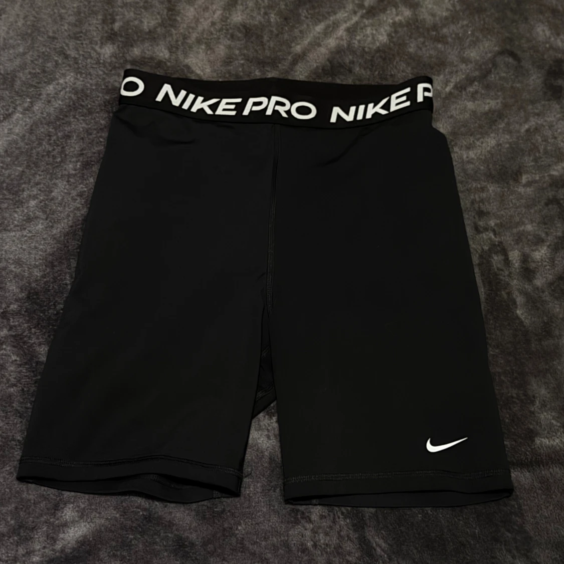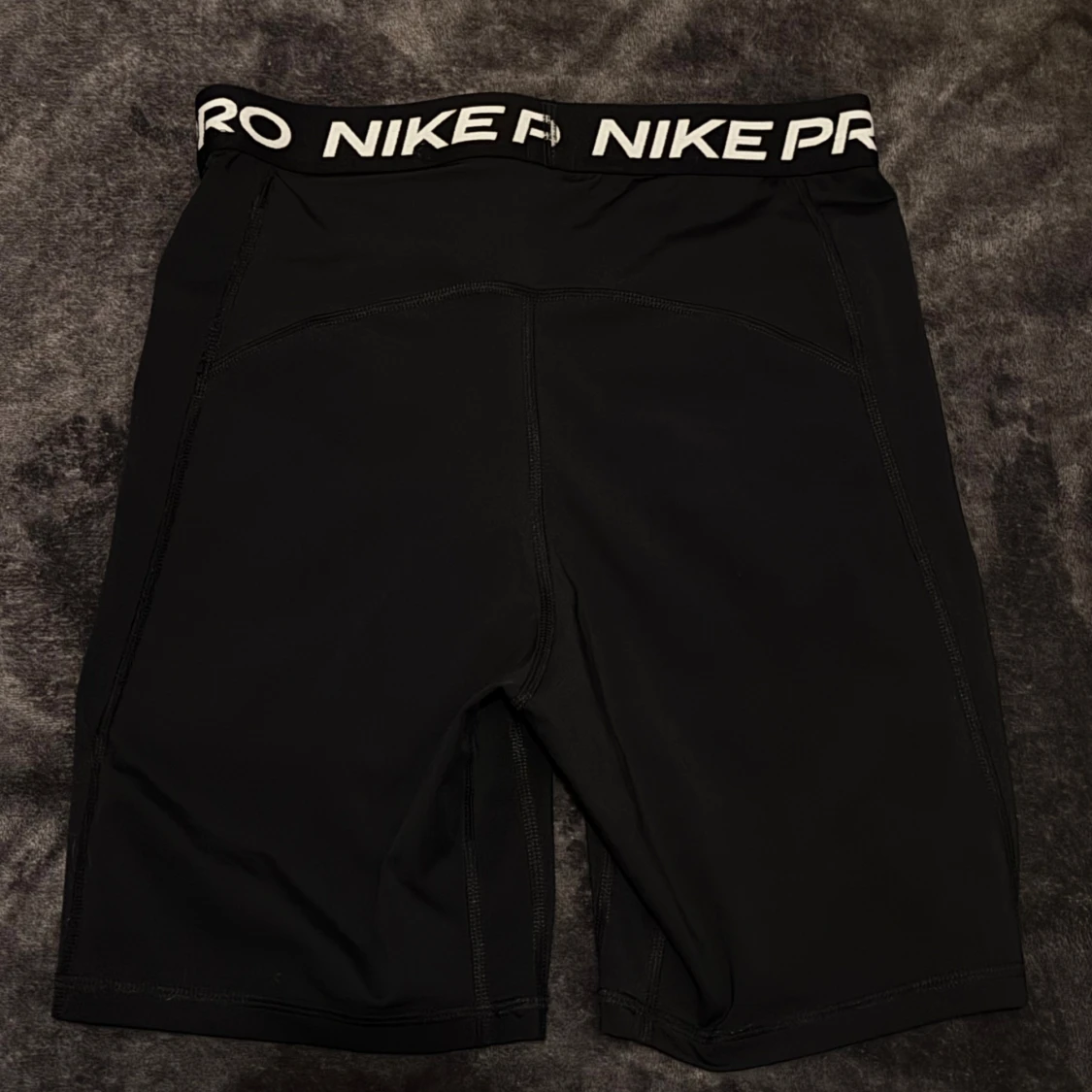 Svarta Nike Pro shorts i tight modell med elastisk midja där det står 'NIKE PRO' i vitt. Perfekta för träning eller sport. Swoosh-logga framtill på benet. Gjorda i stretchigt syntetmaterial för maximal rörelsefrihet.
