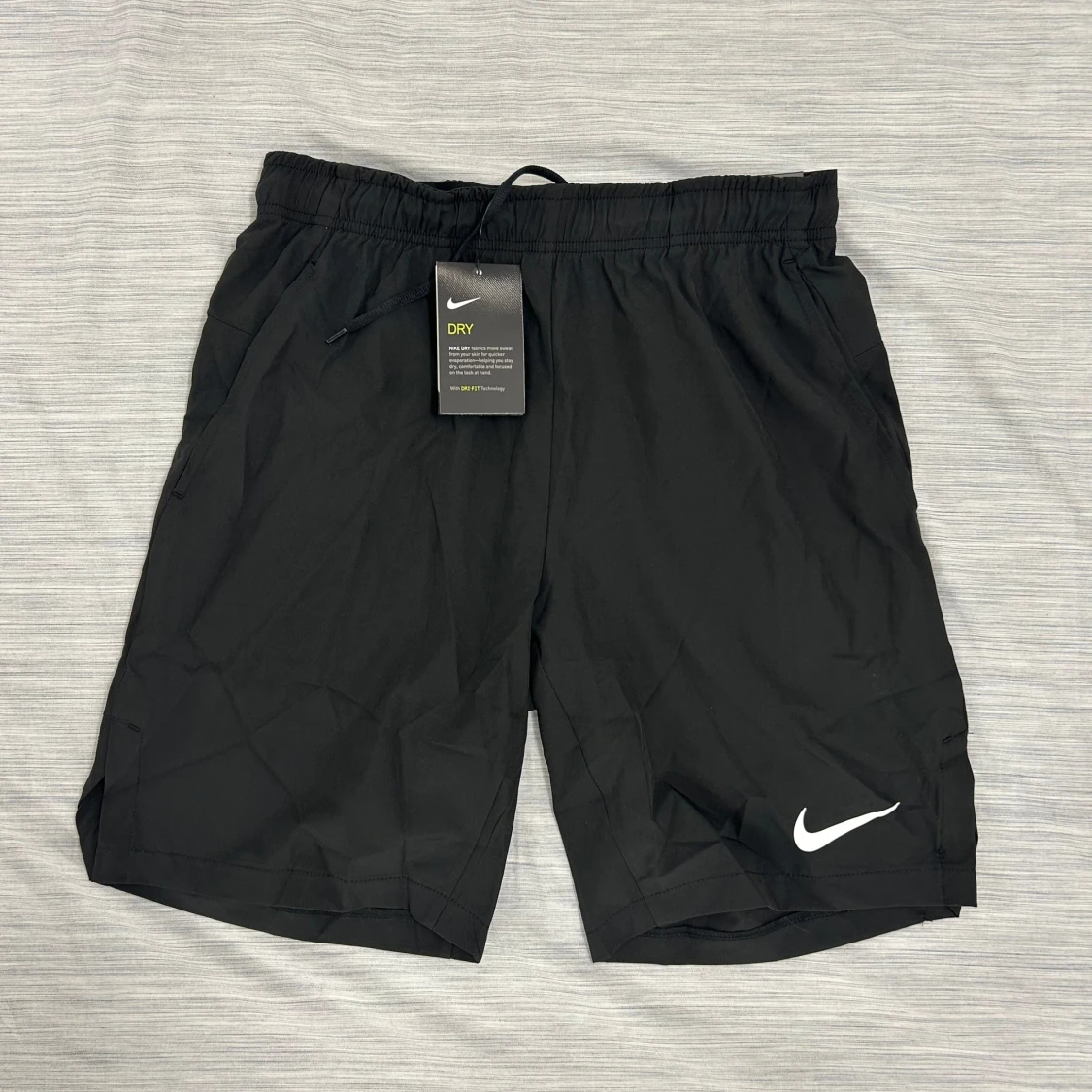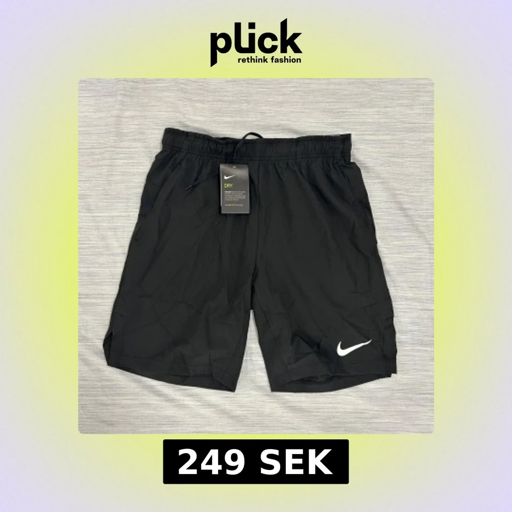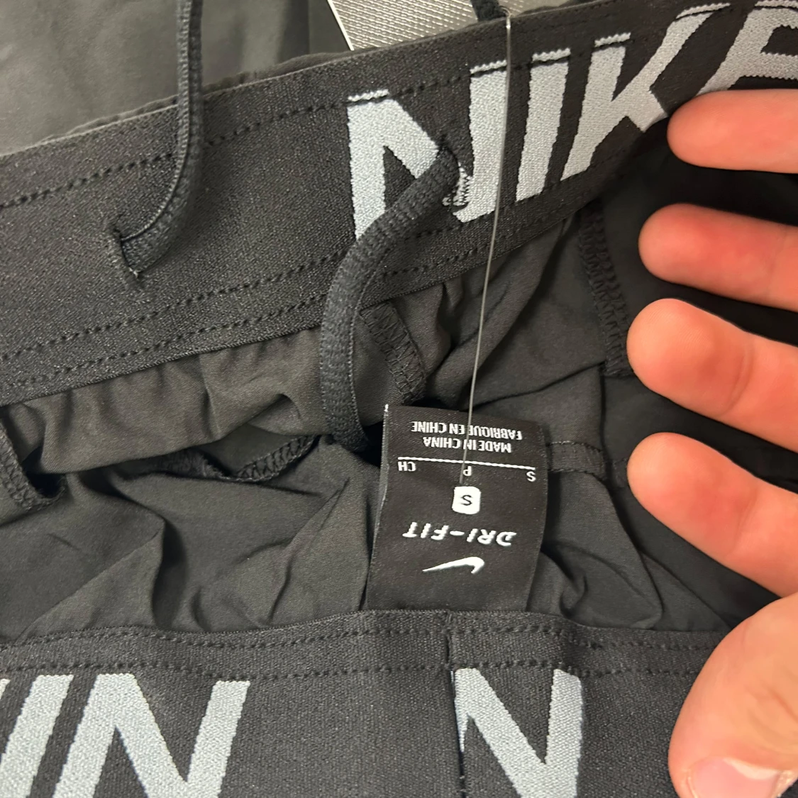 Svarta träningsshorts från Nike med vit logga på benet och elastisk midja med snörning. Tillverkade i lätt och snabbtorkande material med Dri-Fit-teknologi. Perfekta för gymmet eller löprundan, riktigt sköna och stilrena.