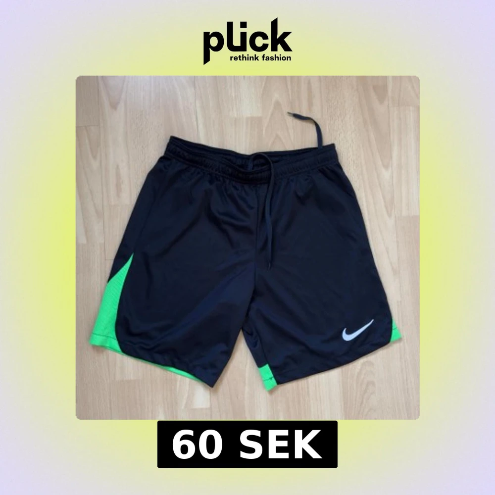 Snygga svarta träningsshorts från Nike med gröna detaljer på sidorna. De har en elastisk midja med snörning för justerbar passform och är perfekta för sport och träning. Nike-loggan är tryckt i vitt på ena benet.