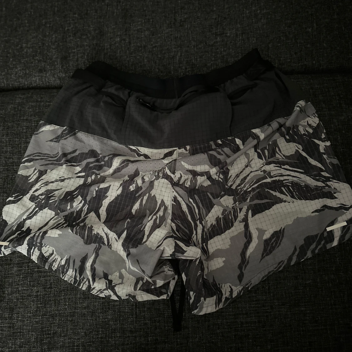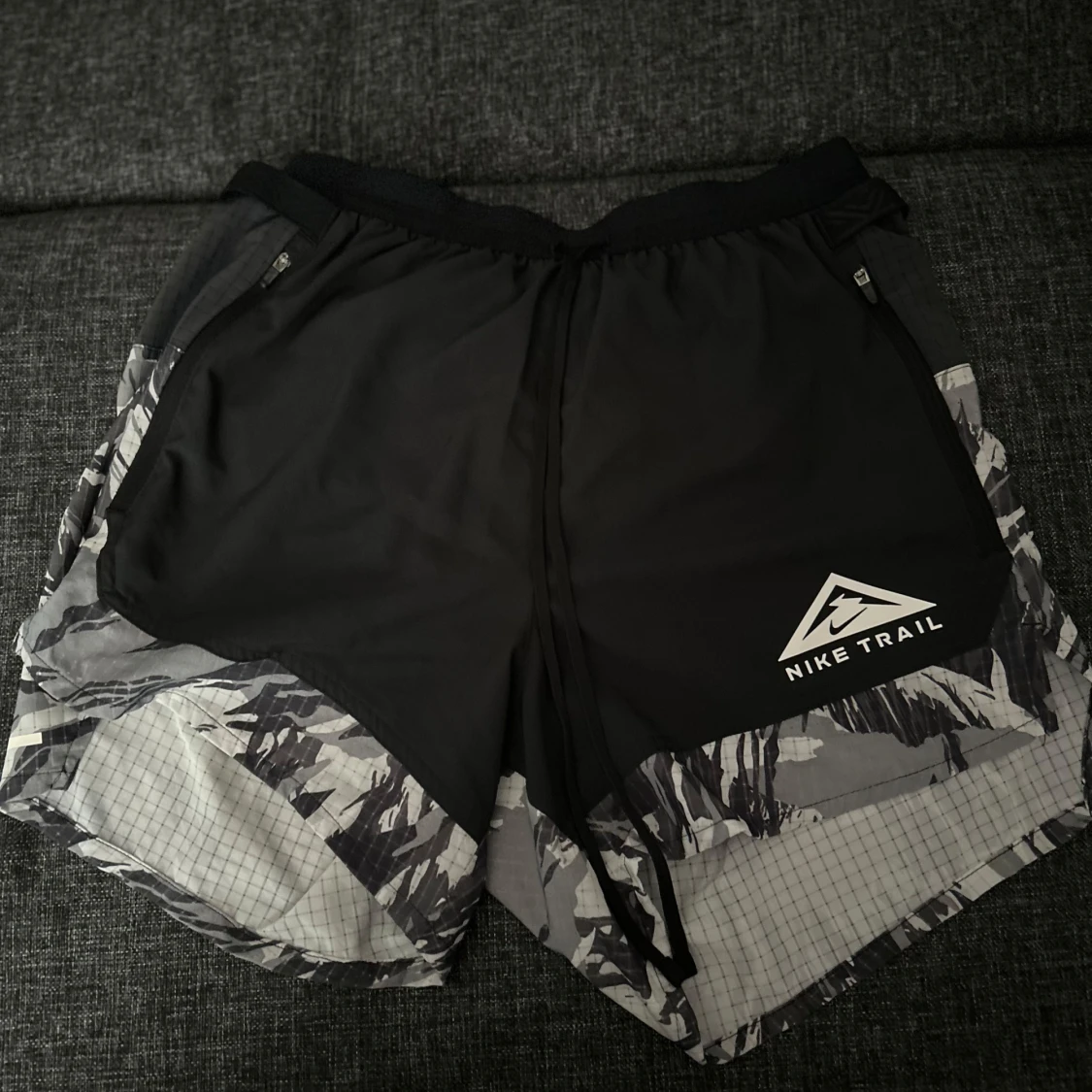 Nike Trail Dri-Fit shorts i svart och grått med coolt camouflage-mönster. Lätta och ventilerande med snörning i midjan och dragkedjefickor. Perfekta för löpning och träning, tillverkade i syntetmaterial som håller dig torr och bekväm.