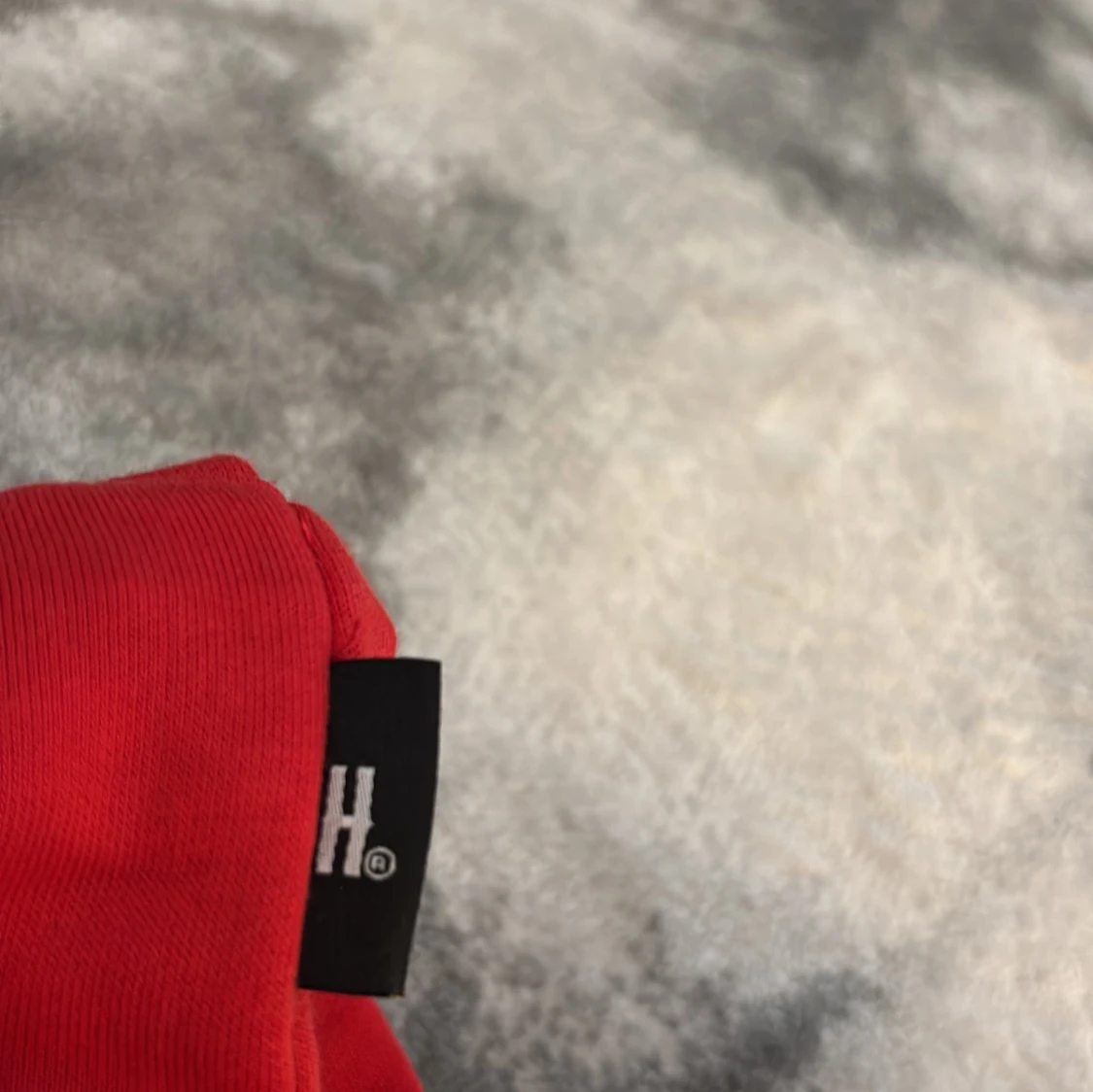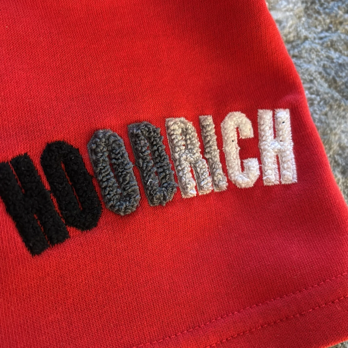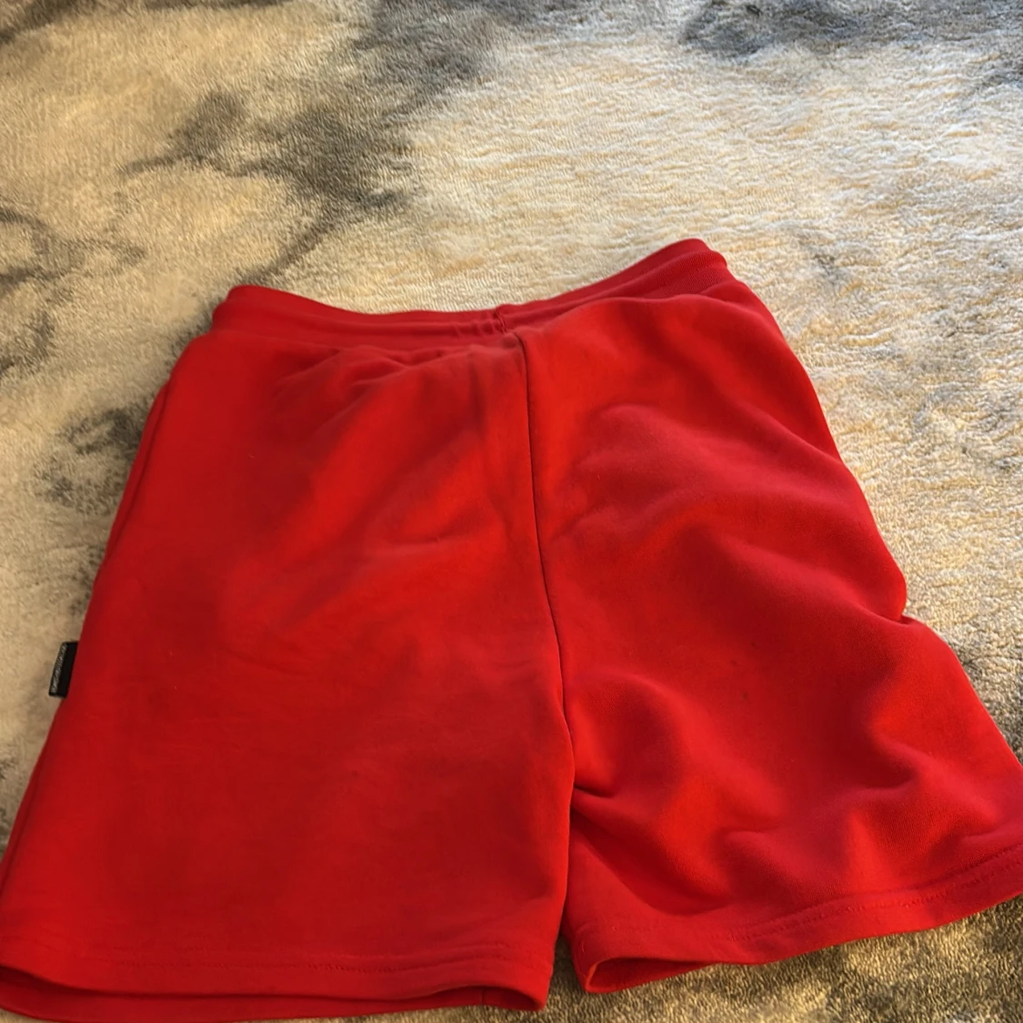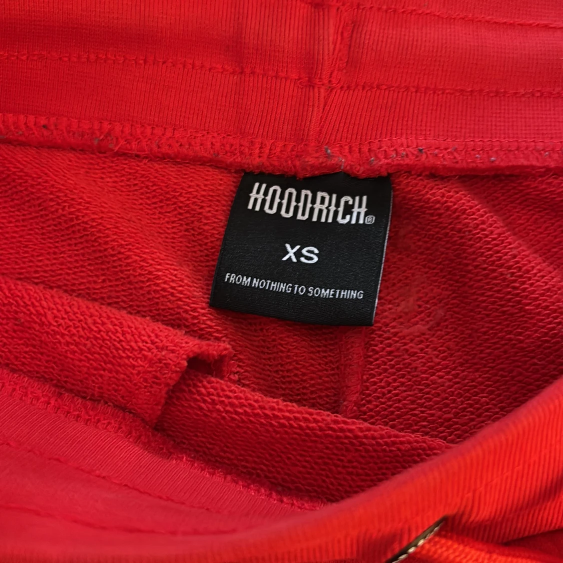 Röda shorts från Hoodrich med broderad logga i svart, grått och vitt på ena benet. Modellen har snörning i midjan och sidofickor. Mjukt material som känns skönt mot huden, perfekt för chill dagar eller träning.