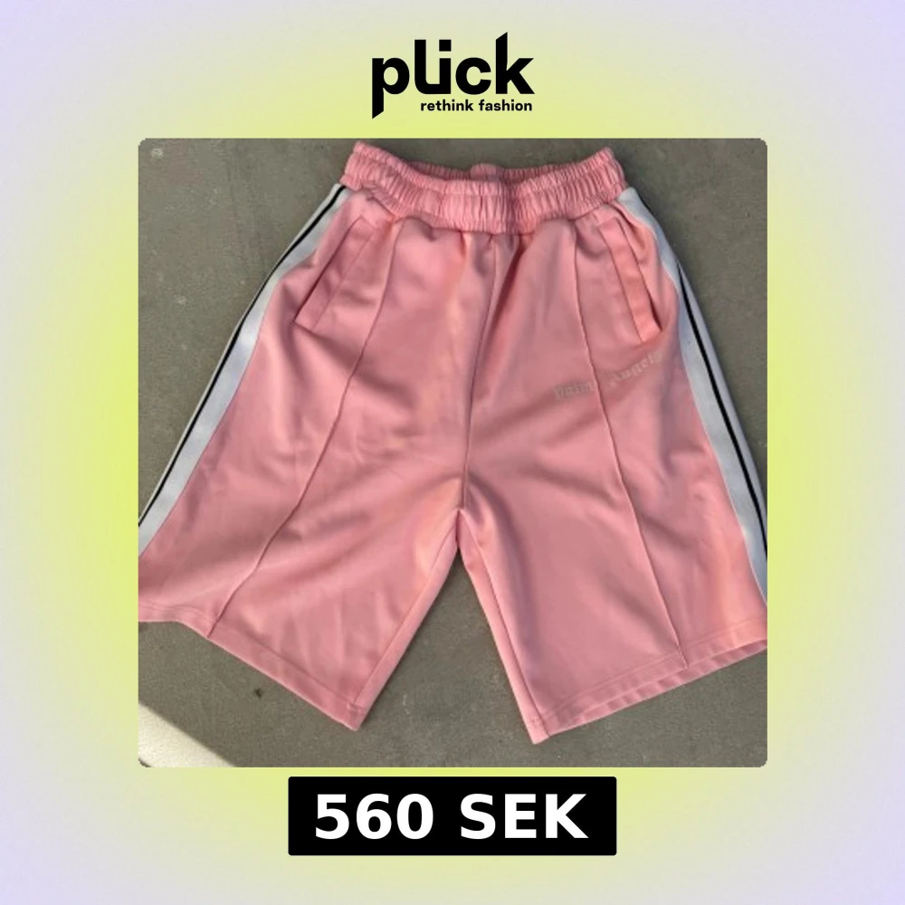 Säljer ett par snygga rosa shorts från Palm Angels med vita ränder längs sidorna. De har elastisk midja, sidofickor och Palm Angels-logga broderad på vänster ben. Perfekt för dig som gillar streetwear och vill sticka ut med färg. Dom sitter fint under knäna och är rep