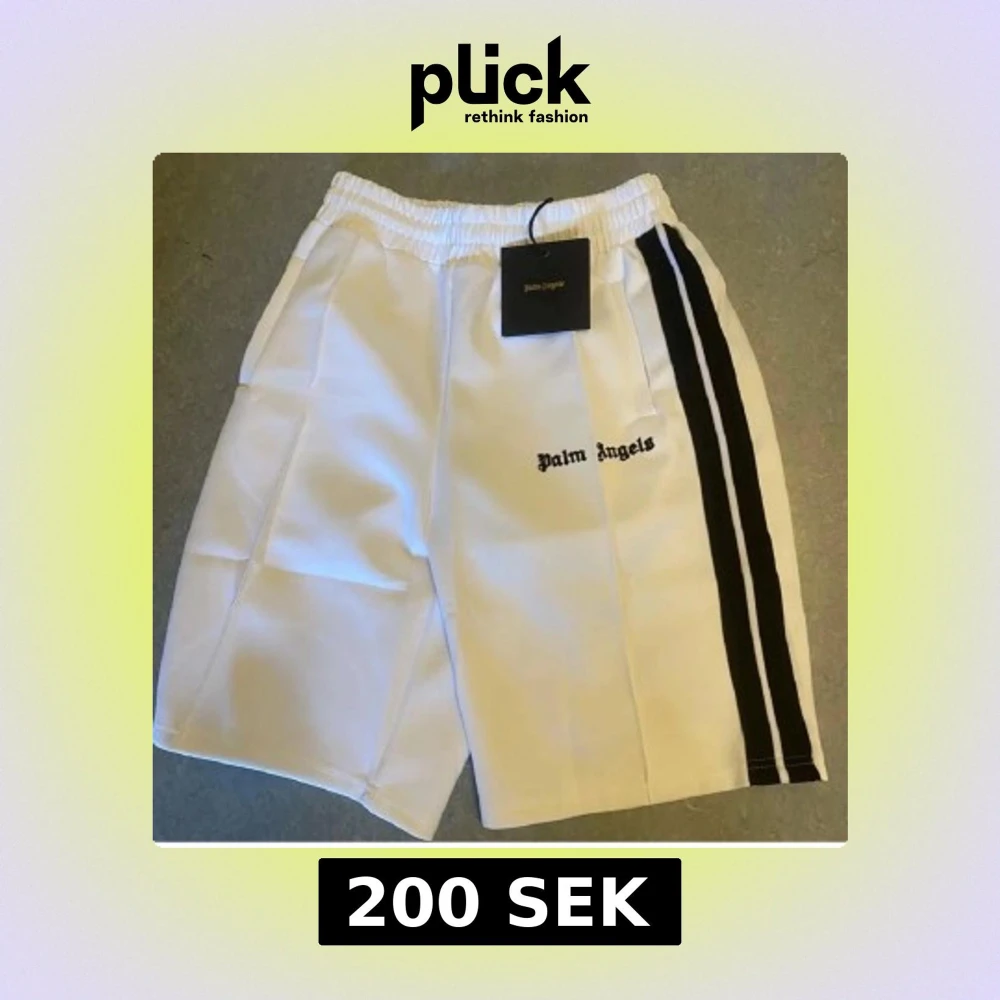 Palm Angels vita shorts med svarta sidoremsor och broderad logga på framsidan. De har elastisk midja och sportig look, perfekta för dig som gillar streetwear. Materialet känns som polyester och passformen är normal. Snygga detaljer med kontrastfärgade ränder.