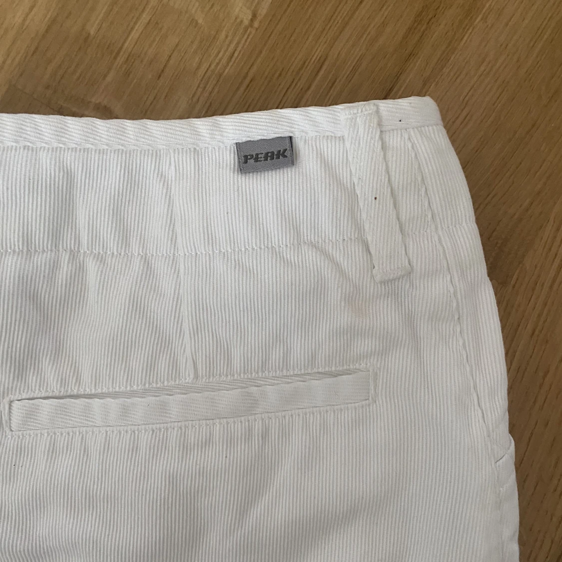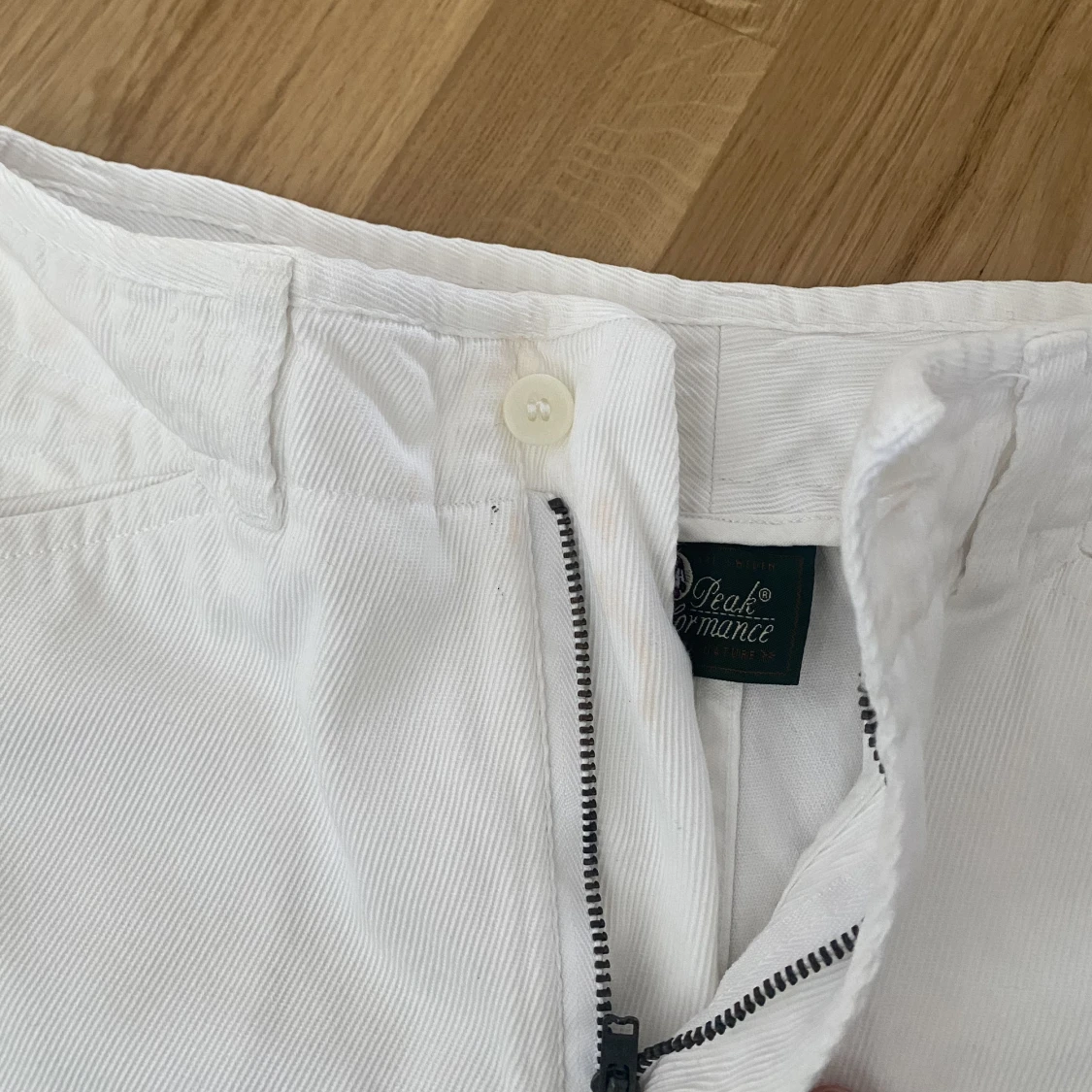 Säljer ett par vita vintage peak performance shorts i st S Skulle säga att de är ganska låga i midjan. Finns lite svaga fläckar här och där men inget som syns mycket