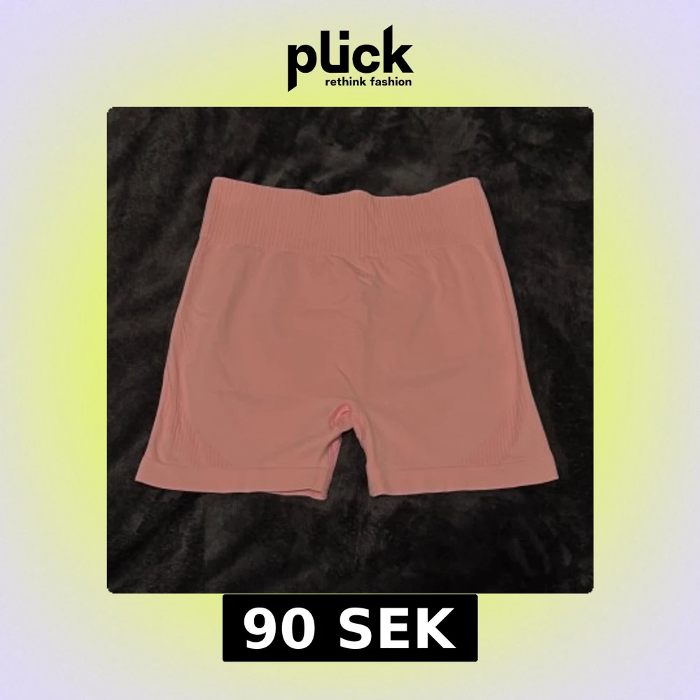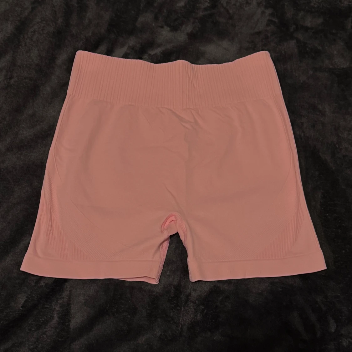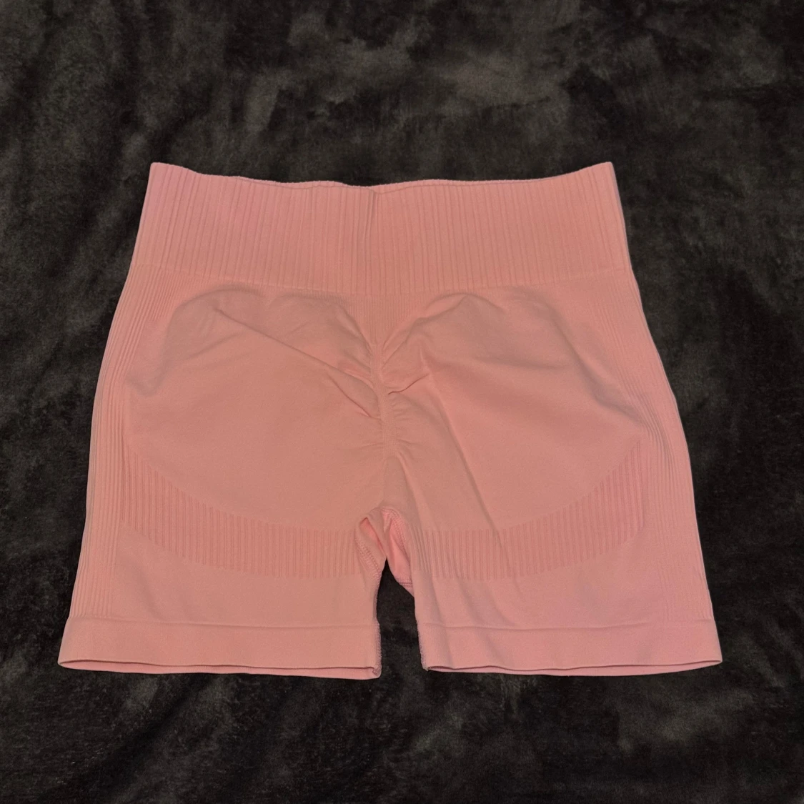 Säljer ett par ljusrosa seamless biker shorts med hög midja och ribbade detaljer. De är stretchiga och har scrunch-effekt bak för en snygg passform. Perfekta för träning eller chill dagar.
