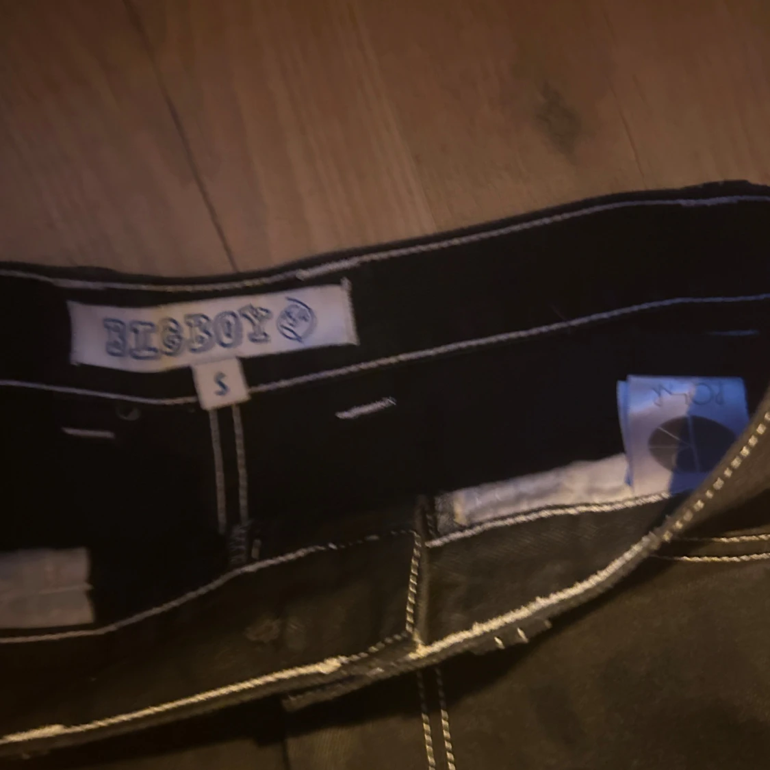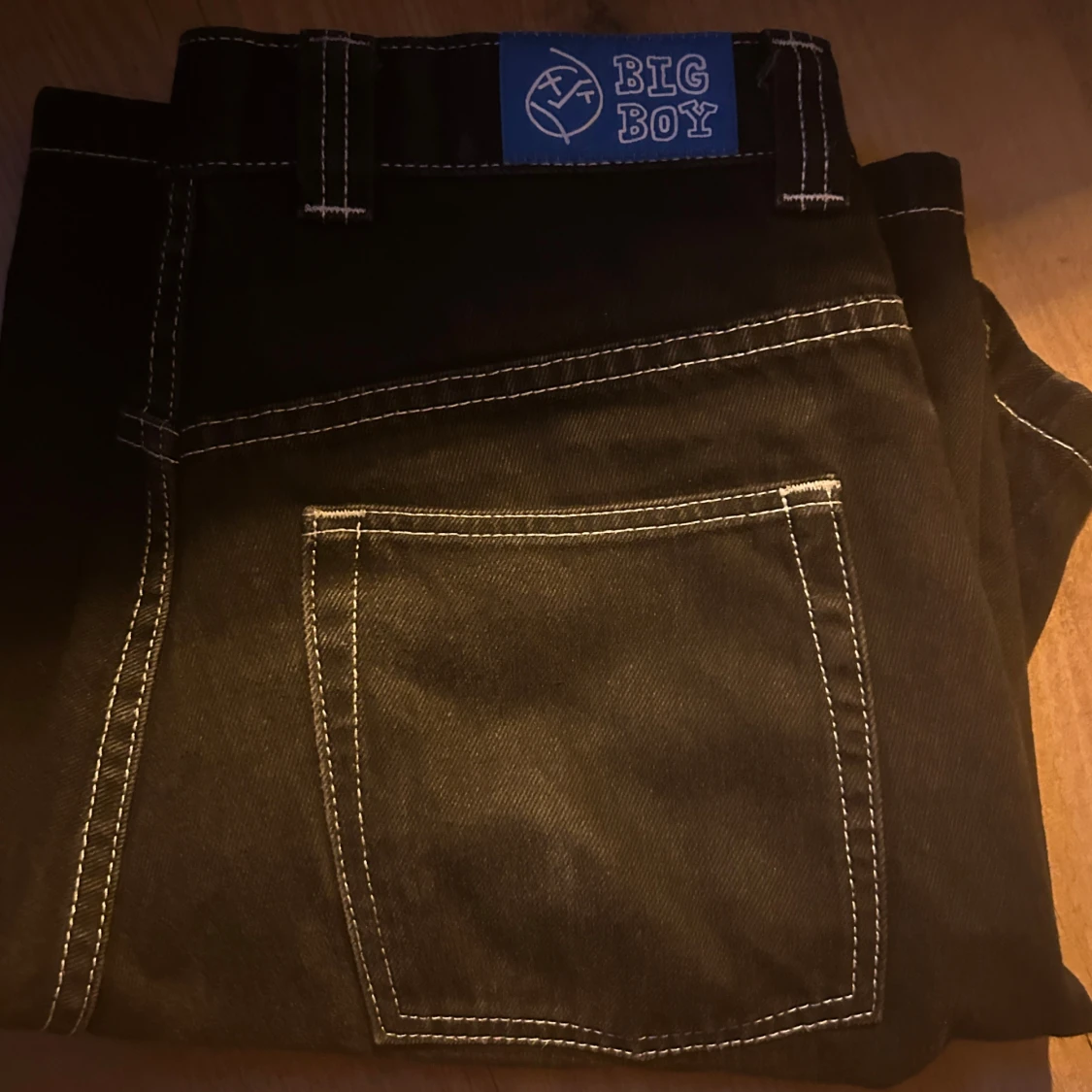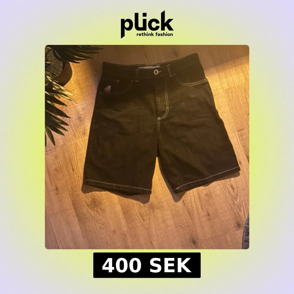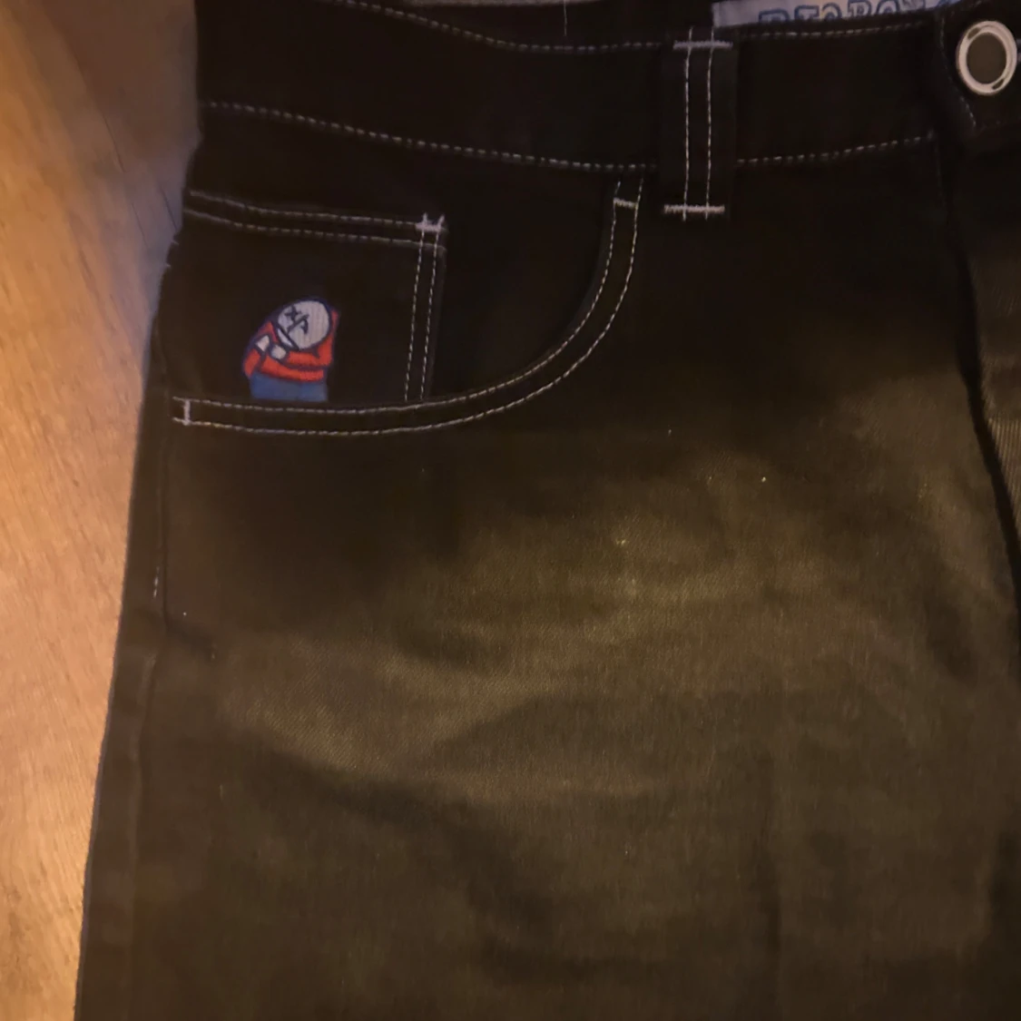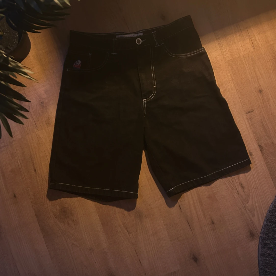 Svarta jeansshorts från Bigboy med kontrasterande vita sömmar och klassisk femficksdesign. På myntfickan finns en liten broderad detalj i rött och blått. Shortsen har normal passform och stängs med knapp och dragkedja. Storlek S men skulle säga ty de passar perfekt till M också! Skriv vid intresse:)
