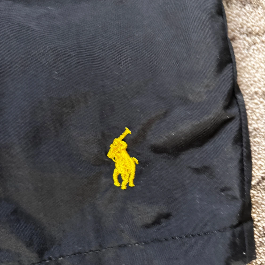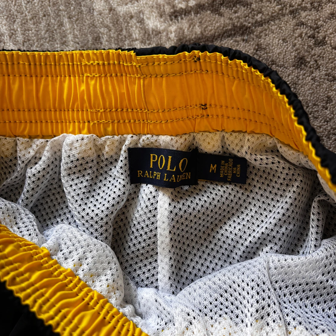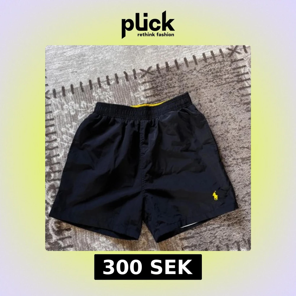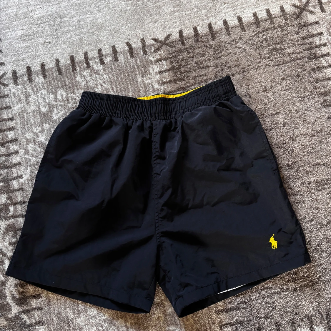 Svarta badshorts från Polo Ralph Lauren med gul broderad logga på benet. Elastisk midja med gul insida och vit mesh-lining. Klassisk passform med bakficka med lock. Perfekta för stranden eller poolen.