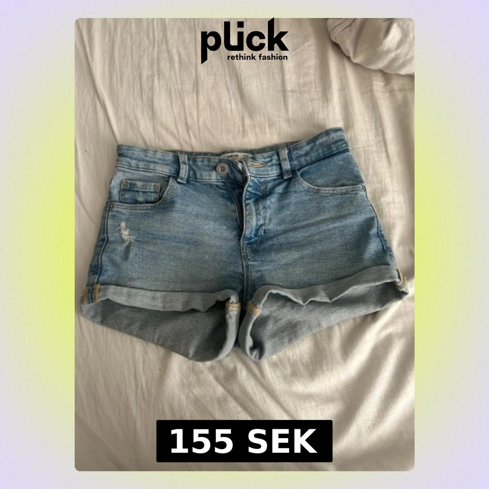 Säljer ett par klassiska blå denimshorts från Pull&Bear med medellåg midja och uppvikta benslut. Shortsen har fem fickor, bälteshällor och en liten sliten detalj framtill. Perfekta för sommaren och lätta att matcha med olika stilar.