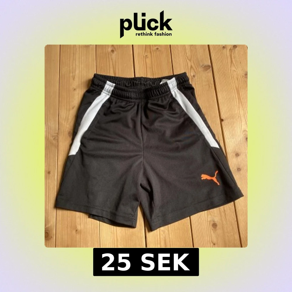 Svarta träningsshorts från Puma med elastisk midja och vita detaljer längs sidorna. Orange Puma-logga framtill. Lätta och sköna shorts i syntetmaterial, perfekta för sport eller gym. Klassisk sportig look med normal passform.
