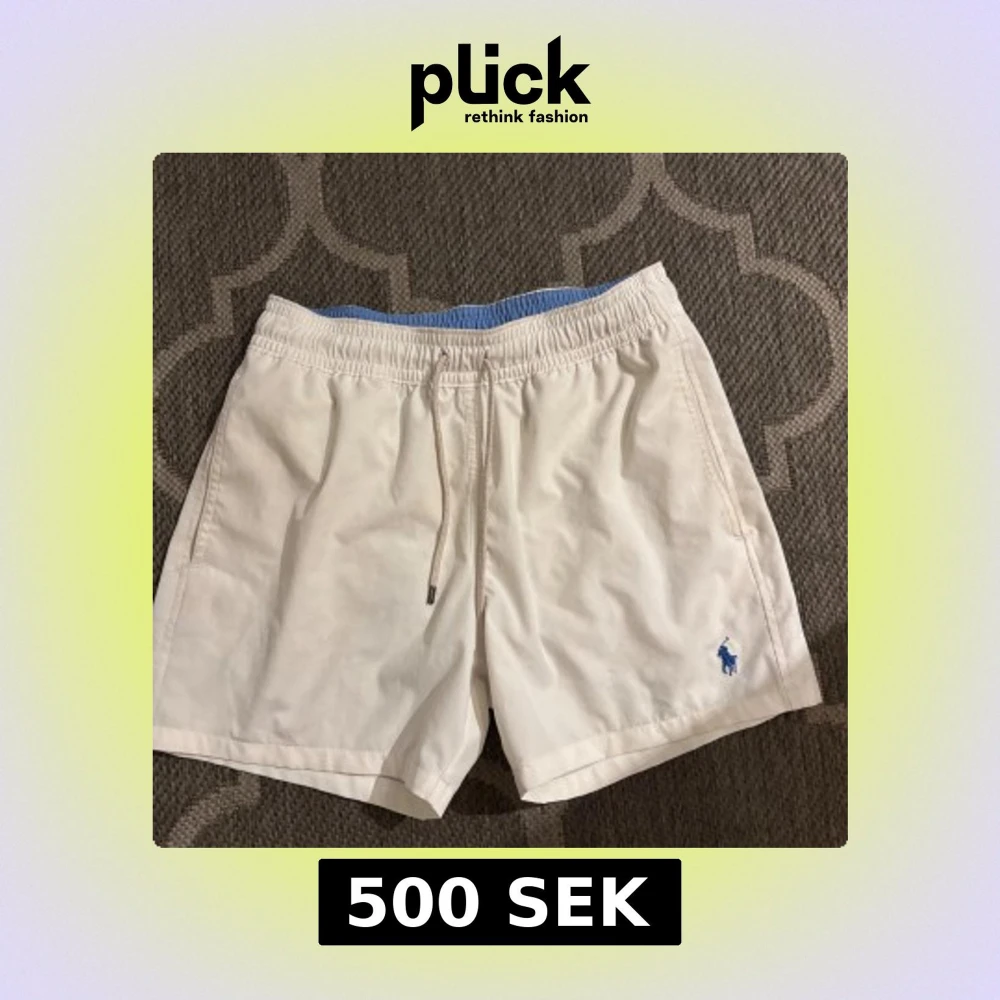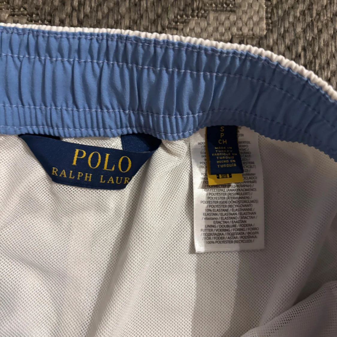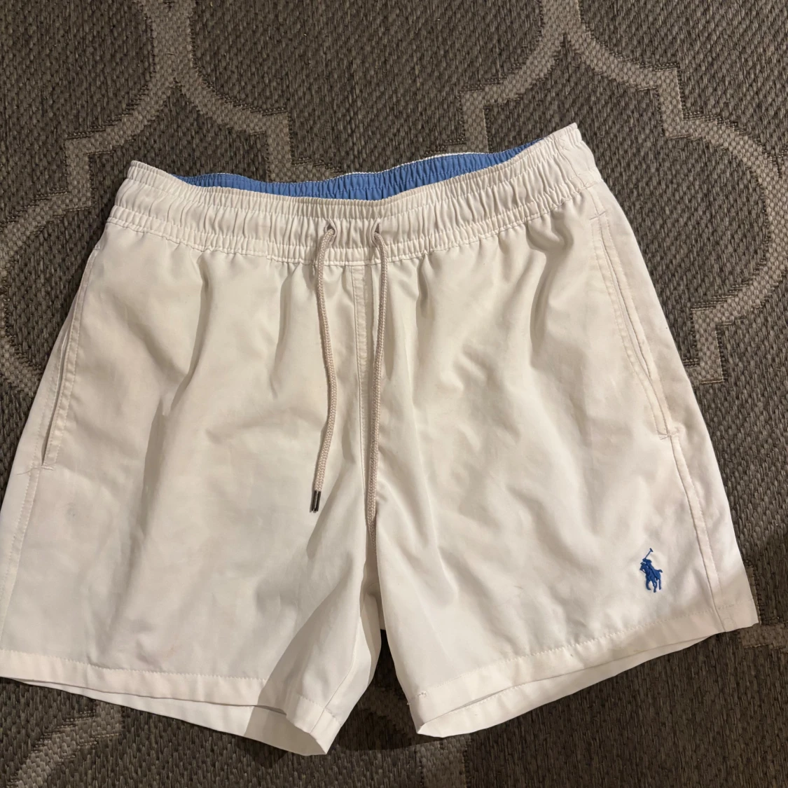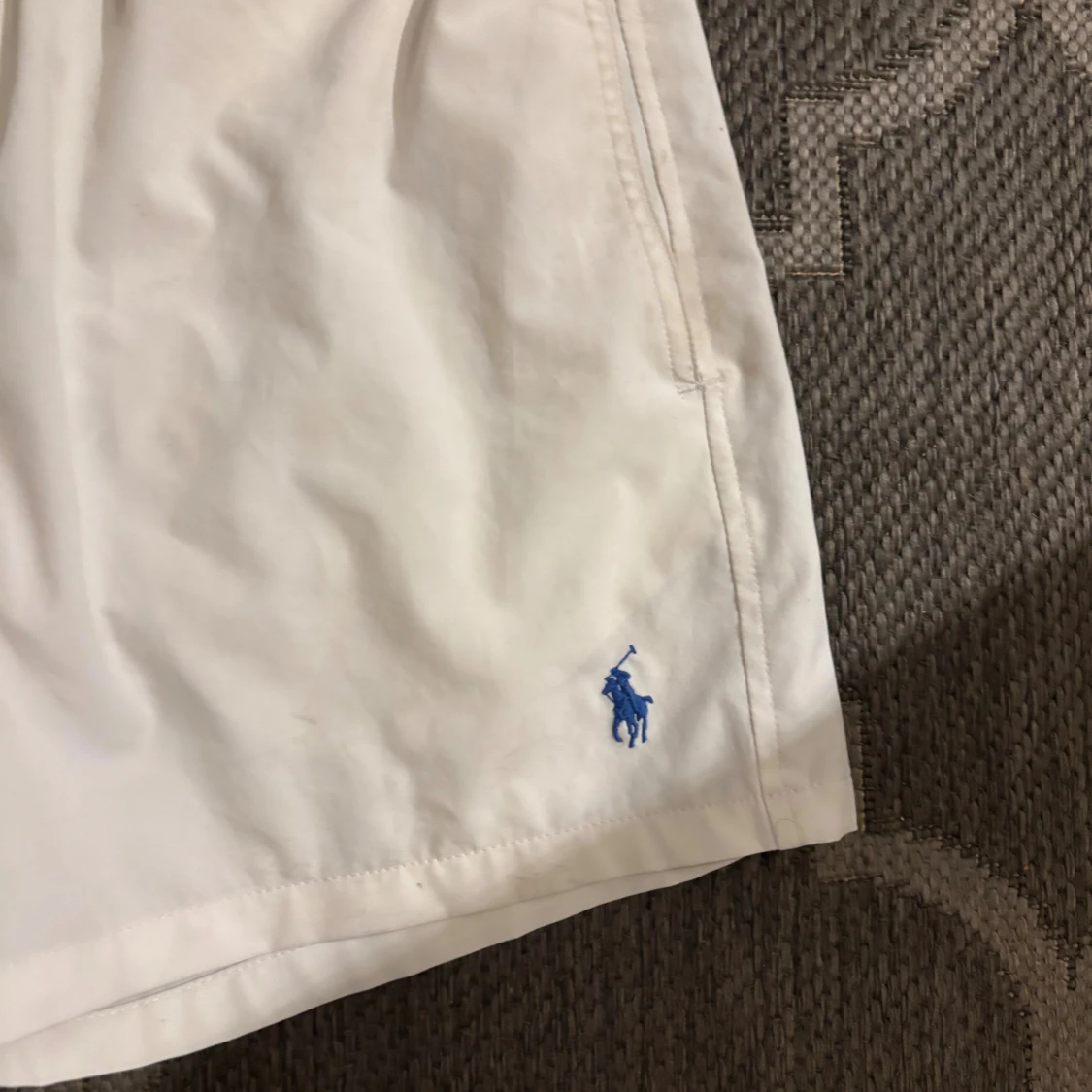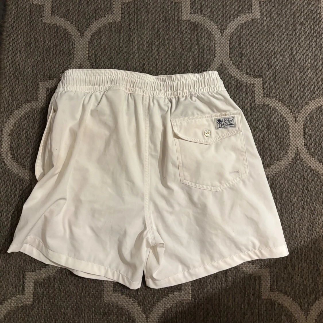 Snygga vita badshorts från Polo Ralph Lauren med blå logga broderad på benet. Shortsen har elastisk midja med snörning, innerbyxa i mesh och en bakficka med knapp. Perfekta för stranden eller poolen, klassisk och clean look. Storlek S och använda max 5 gånger.