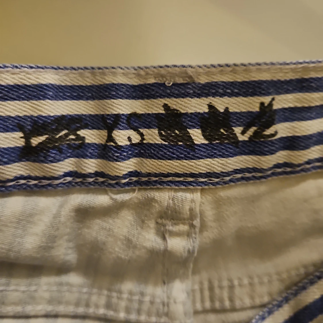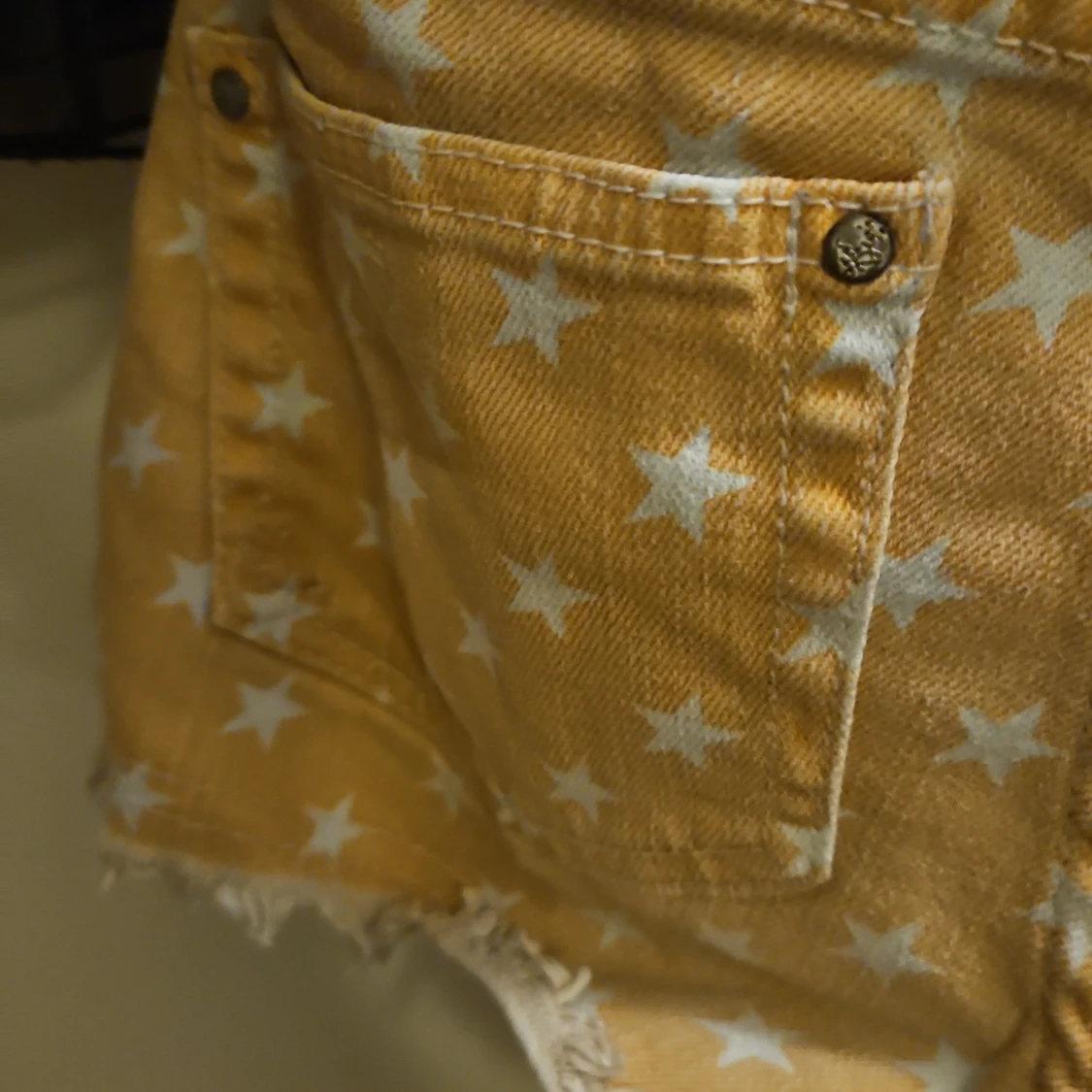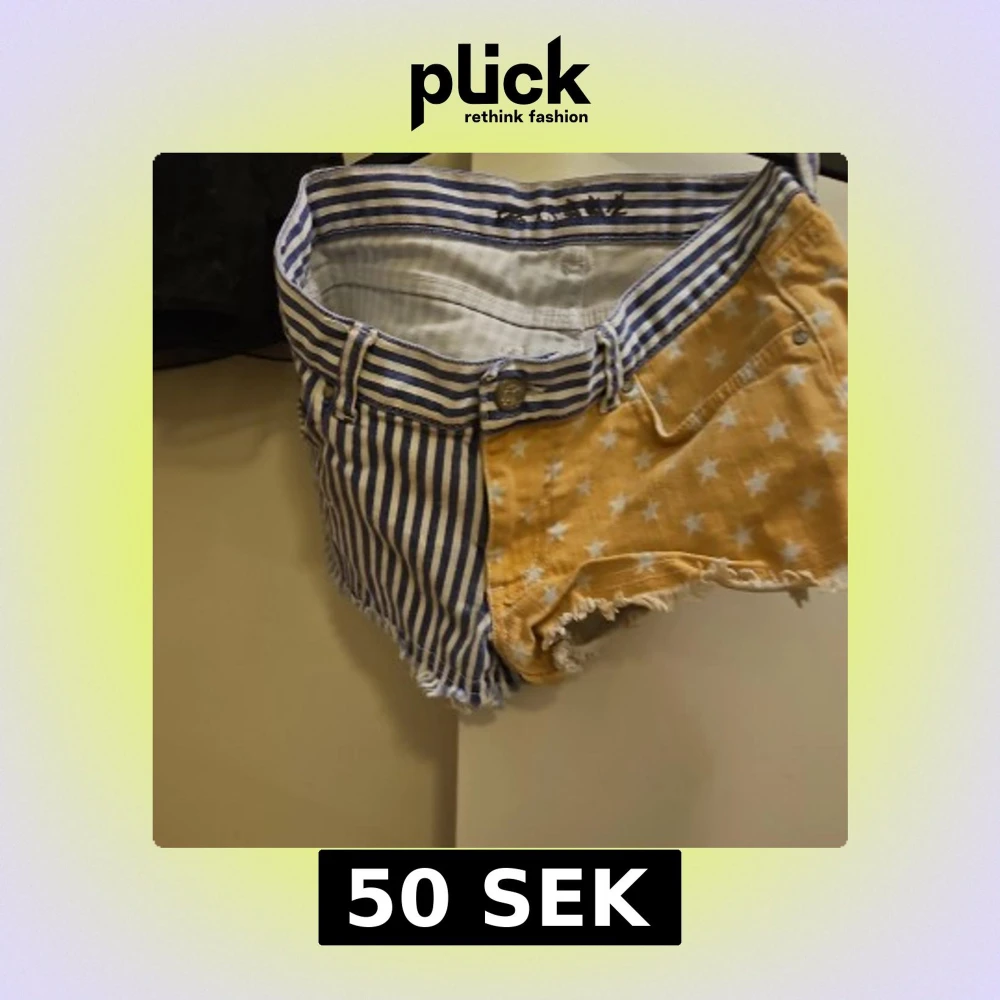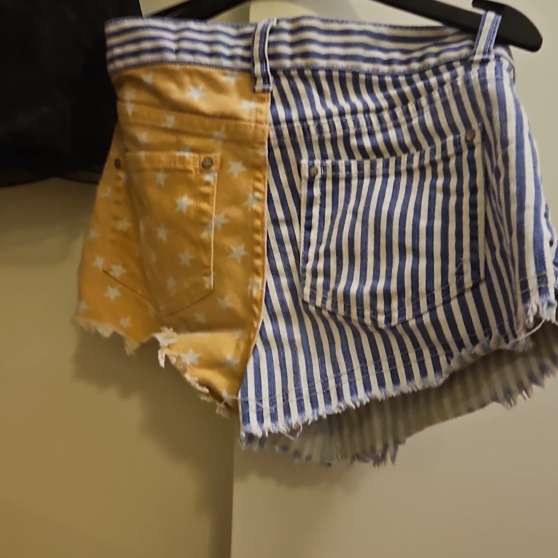 Unika shorts från KSUBI med ena sidan blåvit randig och andra sidan gul med vita stjärnor. Råa kanter nertill ger en cool, avslappnad vibe. Klassisk femficksmodell med knapp och dragkedja. Perfekta för dig som vill sticka ut i sommar!