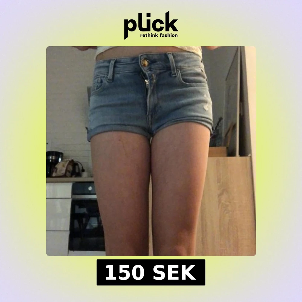 Snygga ljusblå jeansshorts från Replay med klassisk femficksdesign, uppvikta benslut och slitna detaljer framtill. Shortsen har låg midja och en normal passform. Perfekta för varma sommardagar och enkel att matcha med allt. Storleken är okänd men passar folk mellan 10-14 år