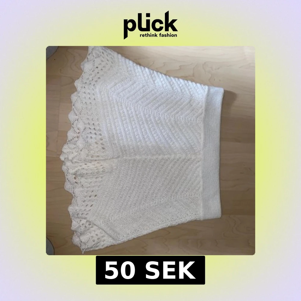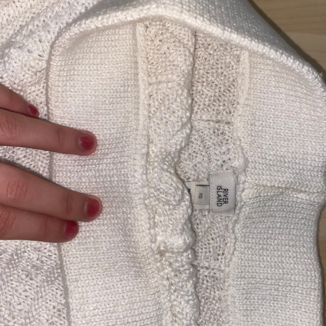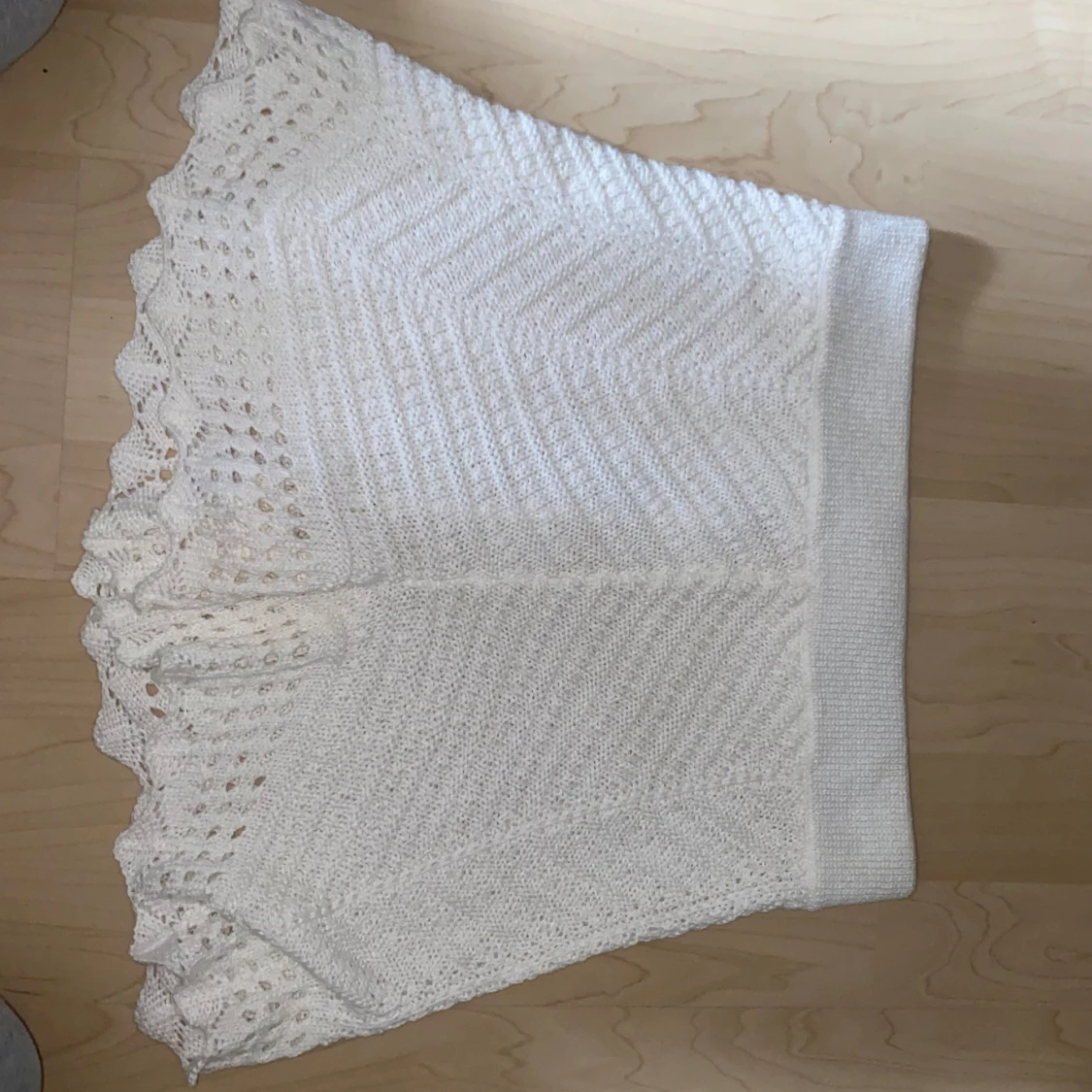 Supersöt vit stickad kjol från River Island med volangkant och snyggt mönstrad struktur. Kjolen är kort och har en bred, bekväm midjeresår. Perfekt för dig som gillar romantiska detaljer och vill ha en unik look.