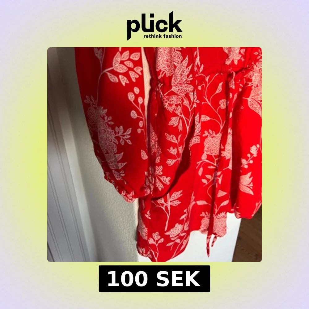 Superfin röd jumpsuit /shorts från H&M med vitt blommigt mönster, v-ringning med osynlig knäppning fram och långa ärmar. Resår och tunt knytband i midjan. Cool modell med praktiska fickor. Skräddad i ett lätt och skönt mjukt material. Perfekt för sommarhalvåret både med eller utan strumpbyxor.